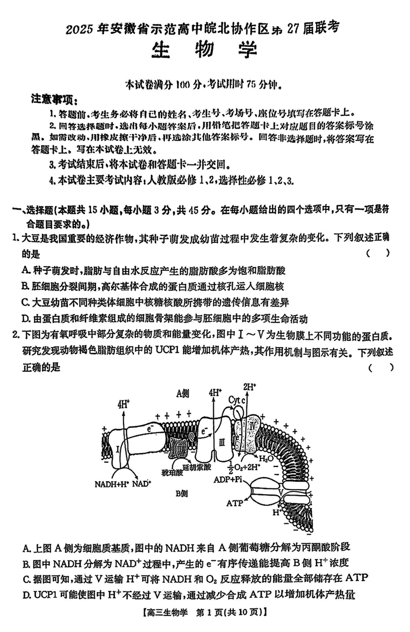 2025年安徽省示范高中皖北协作区第27届联考生物试题及答案汇总