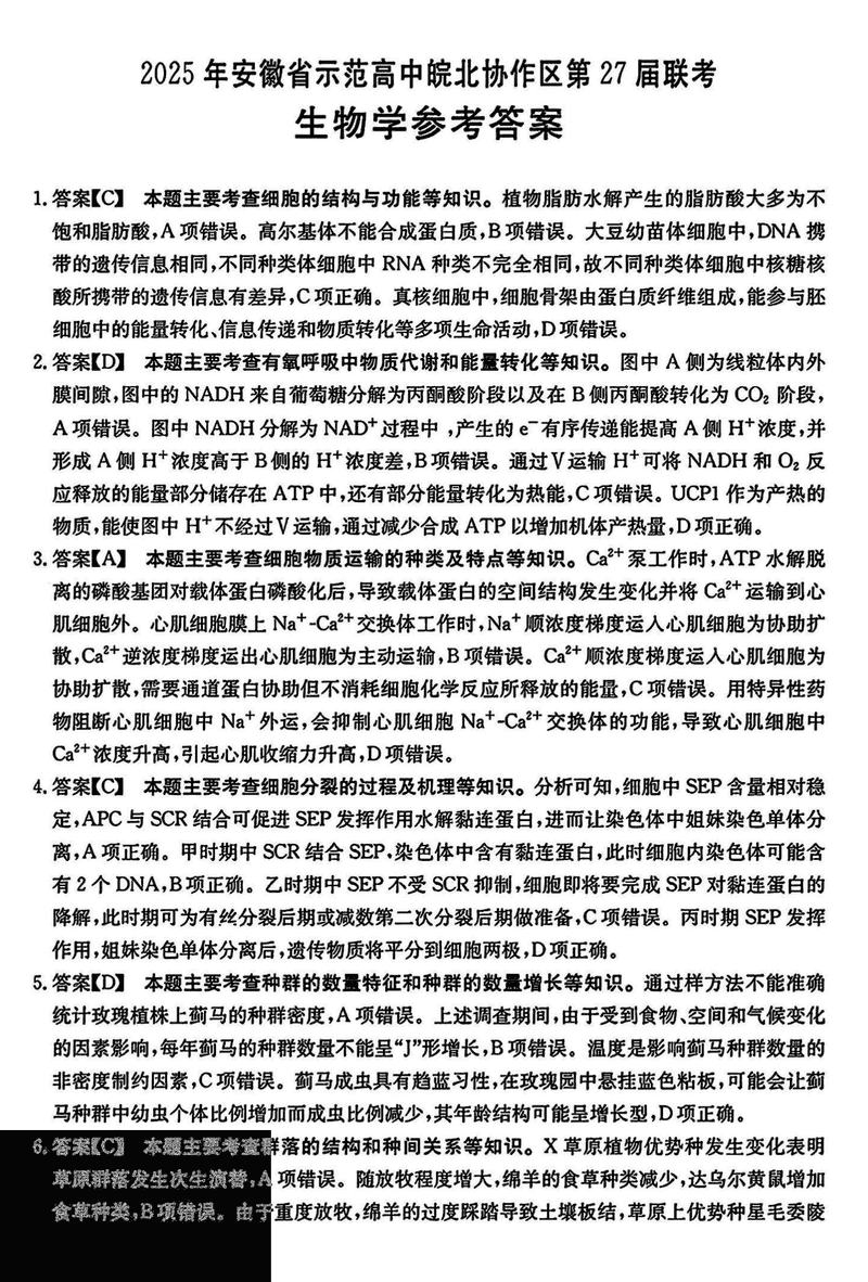 2025年安徽省示范高中皖北协作区第27届联考生物考试已于近日开考,为方便考生考后及时查看考试情况,查漏补缺、弥补不足,本文整理了试题答案解析相关信息!