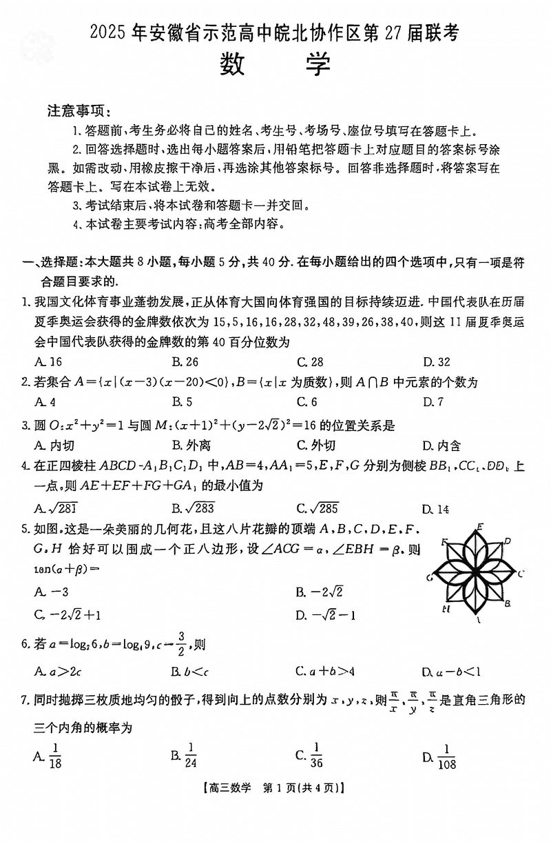汇总:2025年安徽省示范高中皖北协作区第27届联考试题及答案汇总