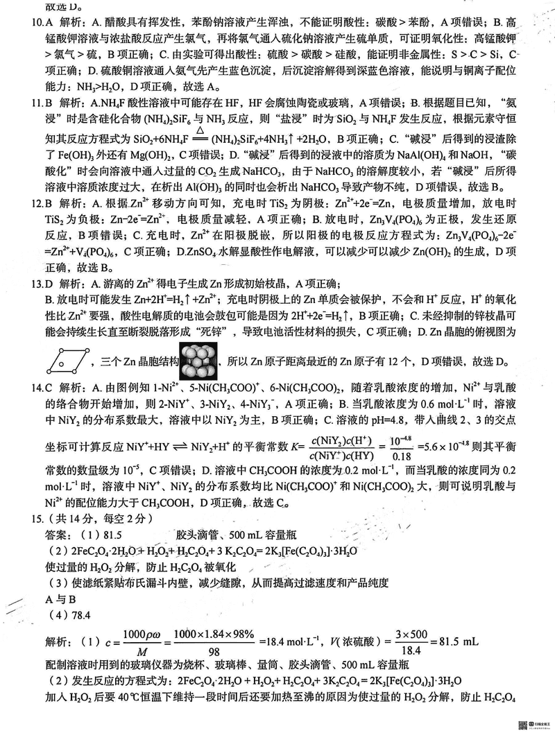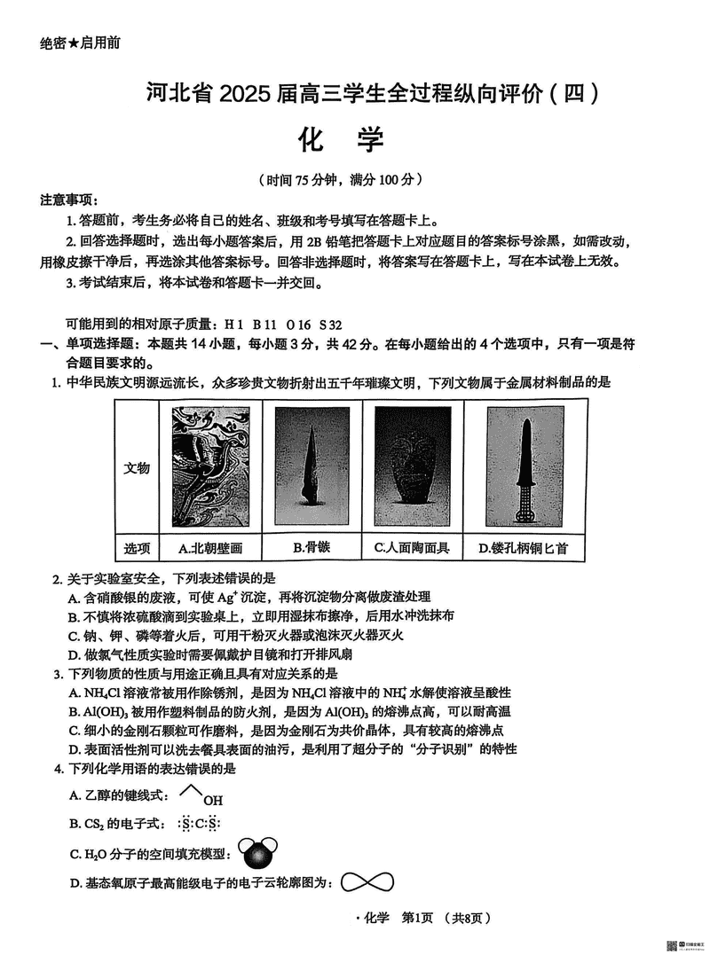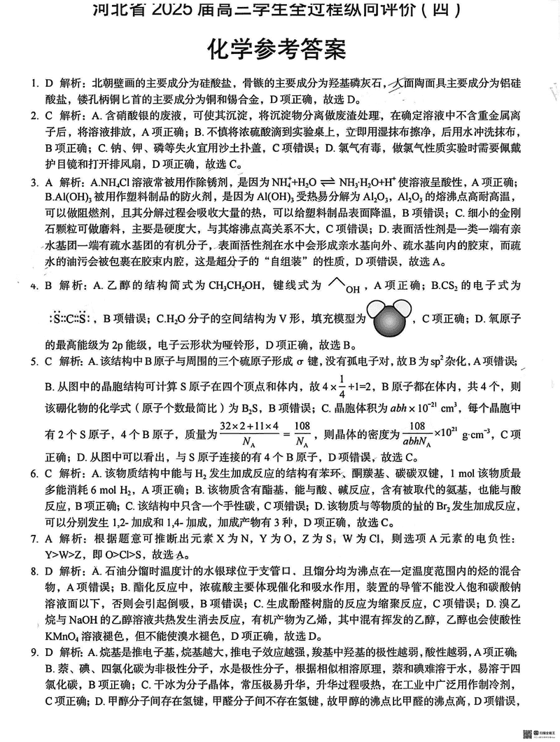 河北省2025届高三学生全过程纵向评价(四)化学考试已于近日开考,为方便考生考后及时查看考试情况,查漏补缺、弥补不足,本文整理了试题答案解析相关信息!