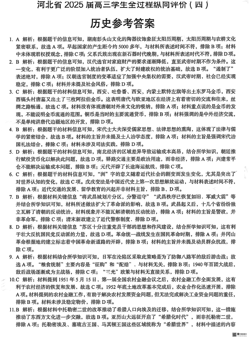 河北省2025届高三学生全过程纵向评价(四)历史考试已于近日开考,为方便考生考后及时查看考试情况,查漏补缺、弥补不足,本文整理了试题答案解析相关信息!