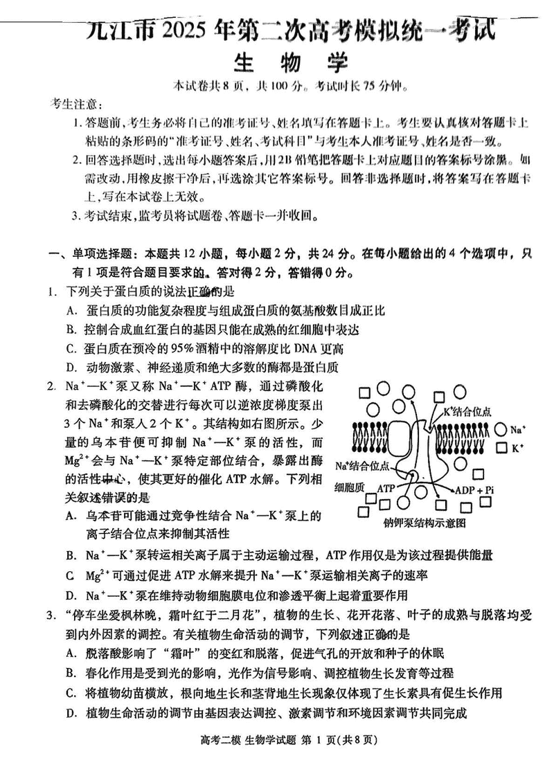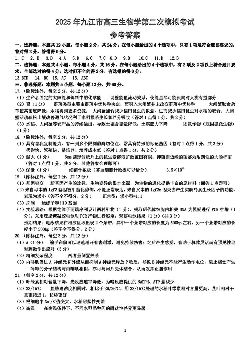 江西省九江市2025年第二次模考生物考试已于近日开考,为方便考生考后及时查看考试情况,查漏补缺、弥补不足,本文整理了试题答案解析相关信息!