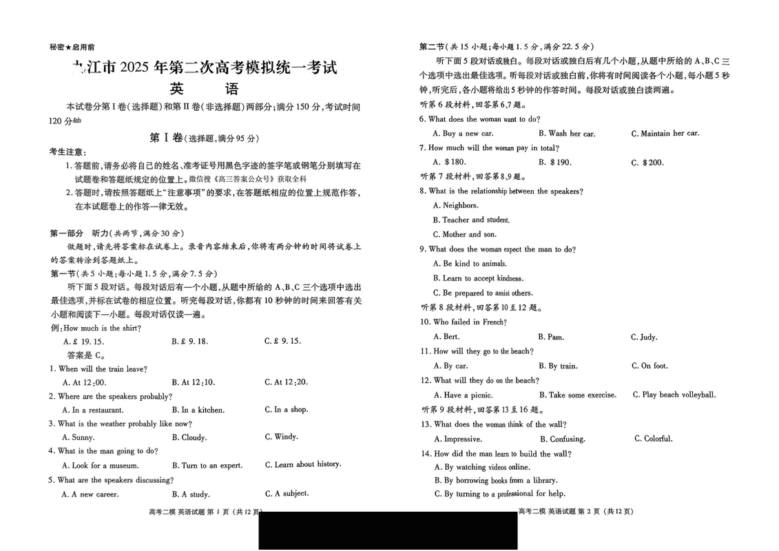 江西省九江市2025年第二次模考英语考试已于近日开考,为方便考生考后及时查看考试情况,查漏补缺、弥补不足,本文整理了试题答案解析相关信息!