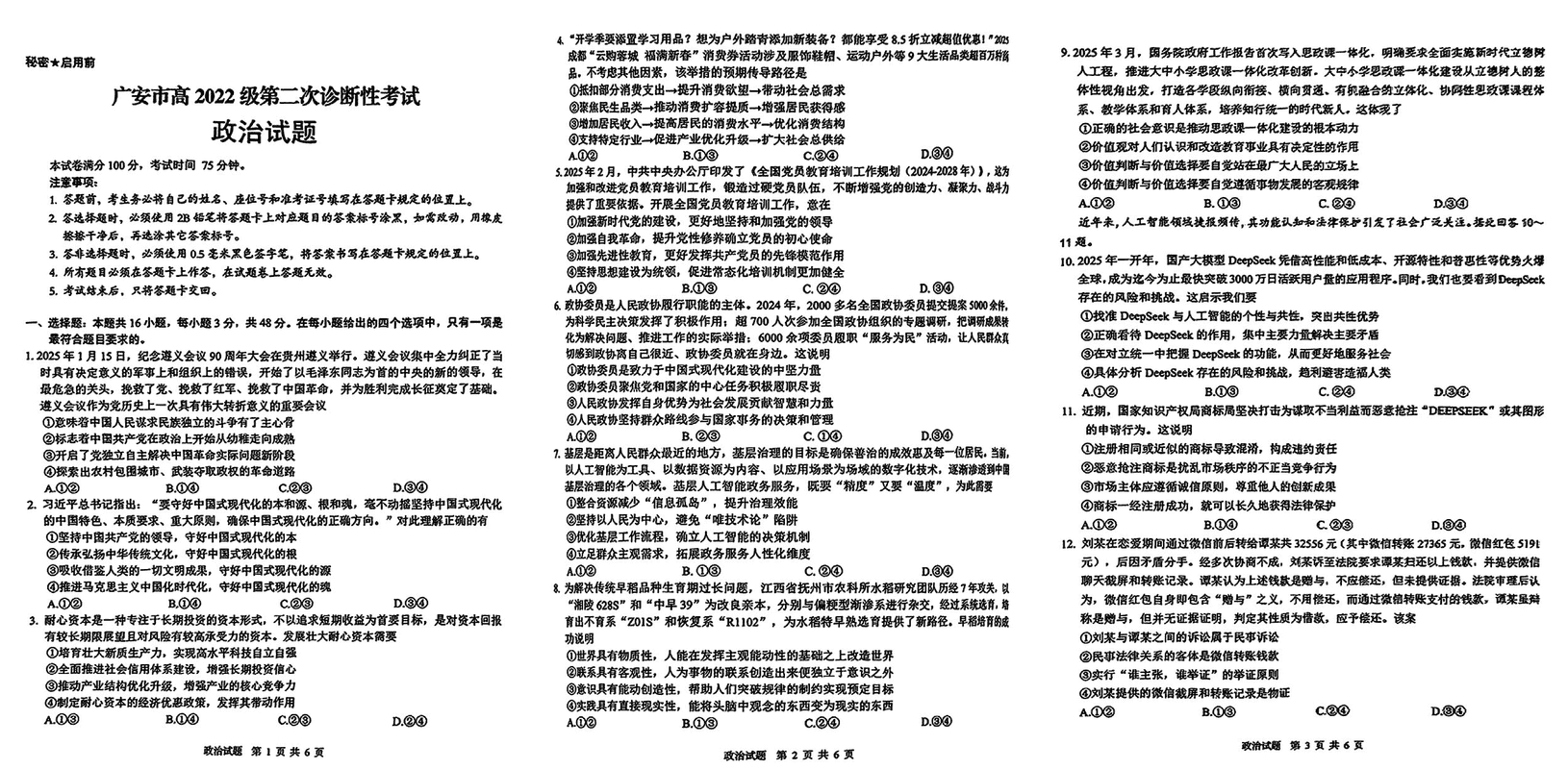 四川六市二诊2025届广安第二次诊断性政治试题及答案 时间:2025-03-31 四川 文综试题 四川六市二诊2025届广安第二次诊断性政治考试已于近日开考,为方便考生考后及时查看考试情况,查漏补缺、弥补不足,本文整理了试题答案解析相关信息! 汇总:四川六市二诊2025届第二次诊断性考试试题及答案汇总 政治试题及答案解析
