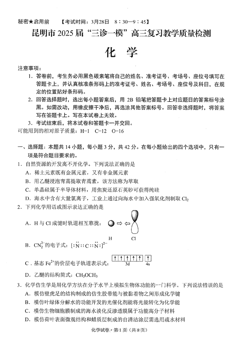 昆明市2025届“三诊一模”高三复习教学质检化学考试已于近日开考,为方便考生考后及时查看考试情况,查漏补缺、弥补不足,本文整理了试题答案解析相关信息!