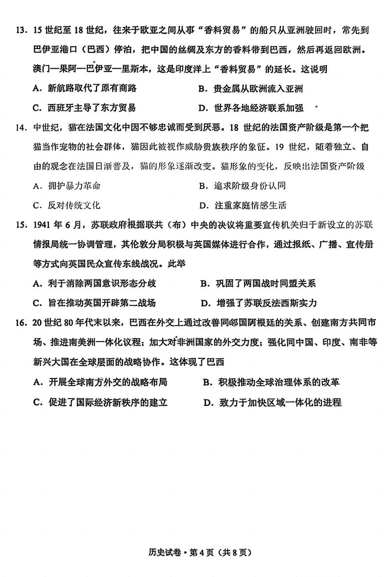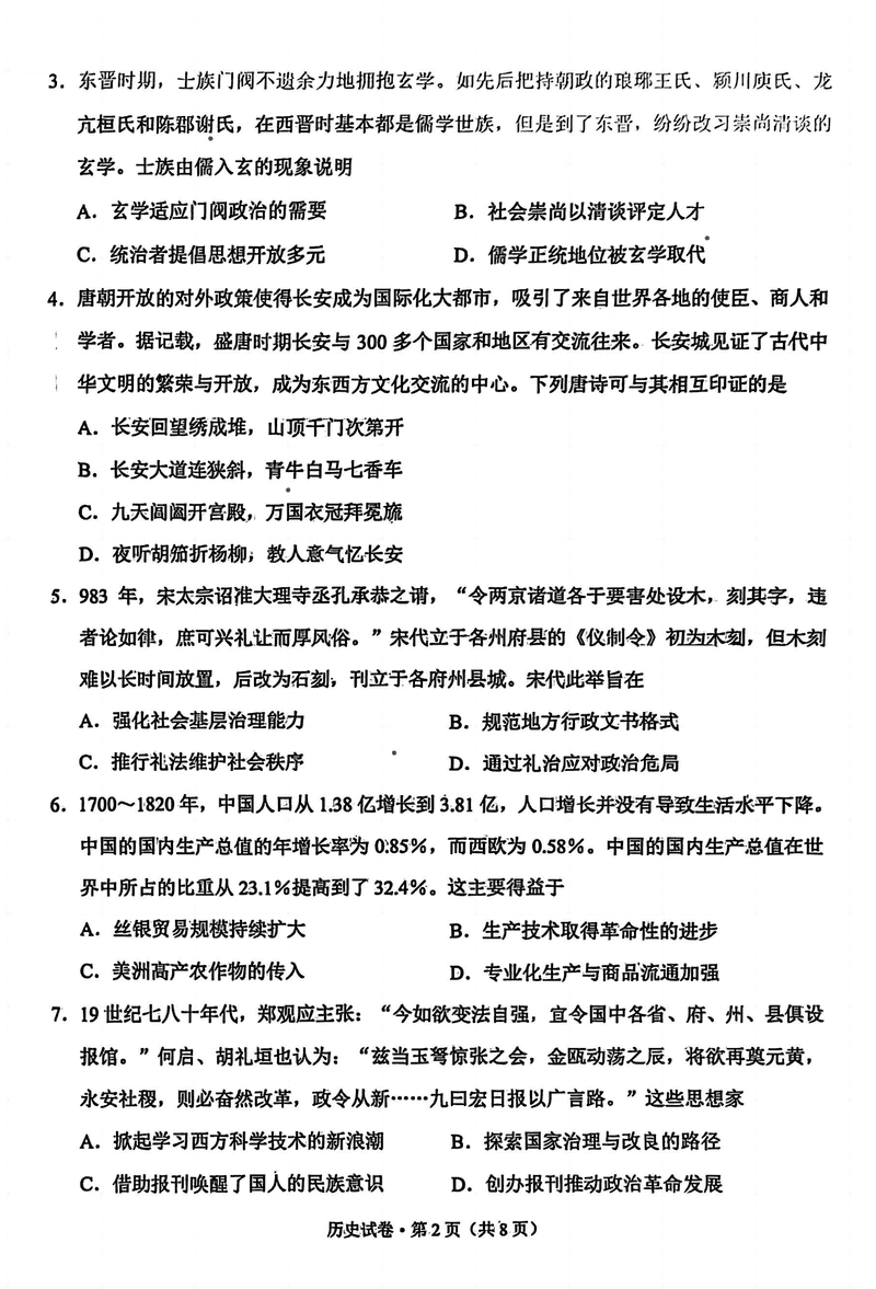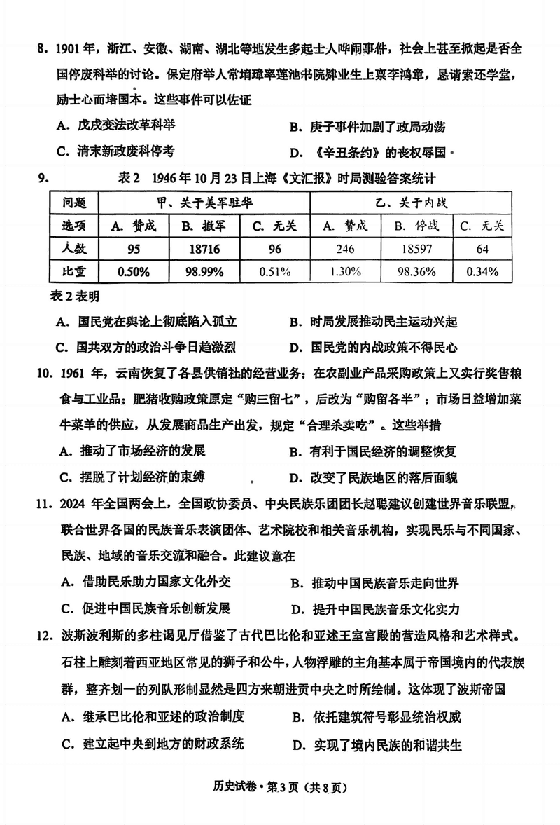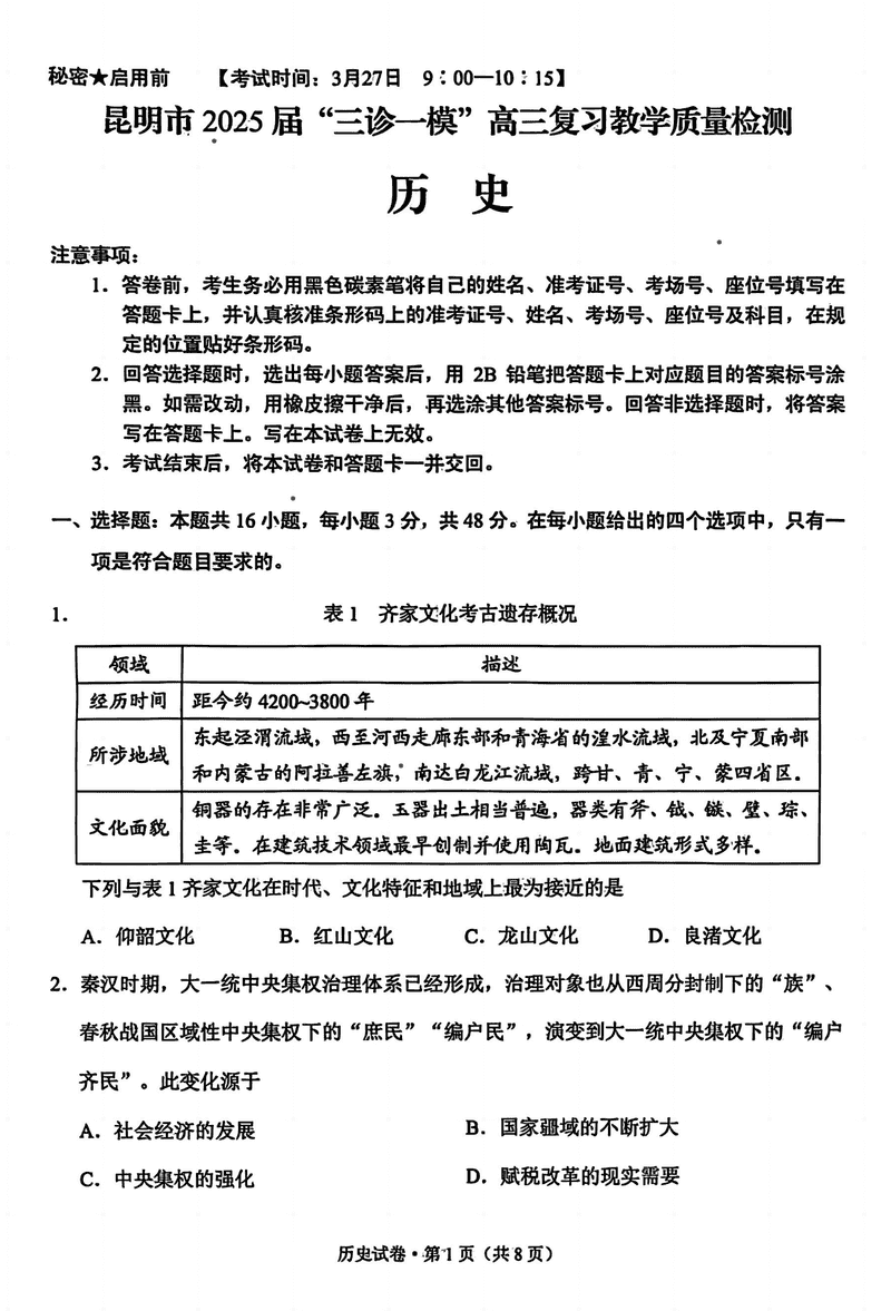 昆明市2025届“三诊一模”高三复习教学质检历史试题及答案