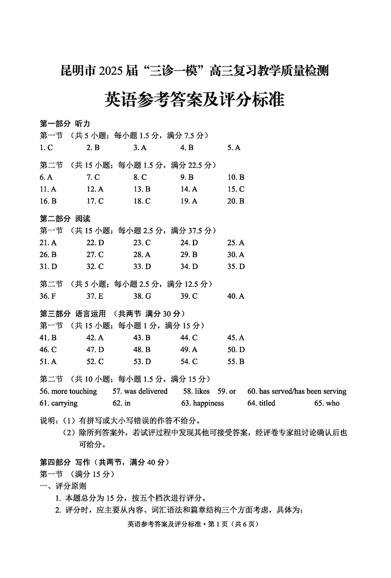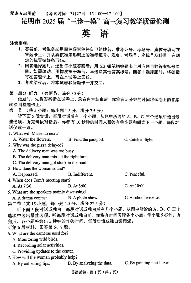 昆明市2025届“三诊一模”高三复习教学质检英语考试已于近日开考,为方便考生考后及时查看考试情况,查漏补缺、弥补不足,本文整理了试题答案解析相关信息!