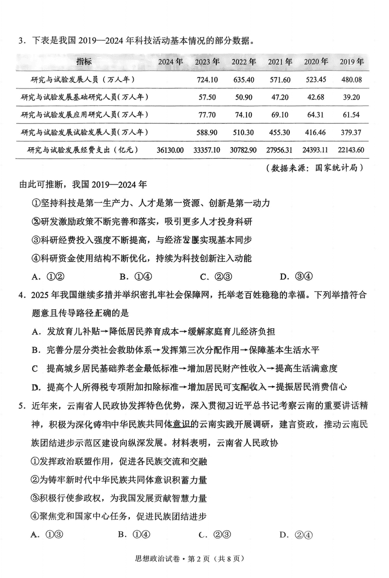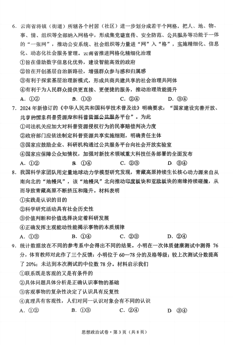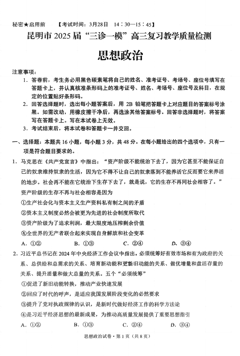 昆明市2025届“三诊一模”高三复习教学质检政治试题及答案