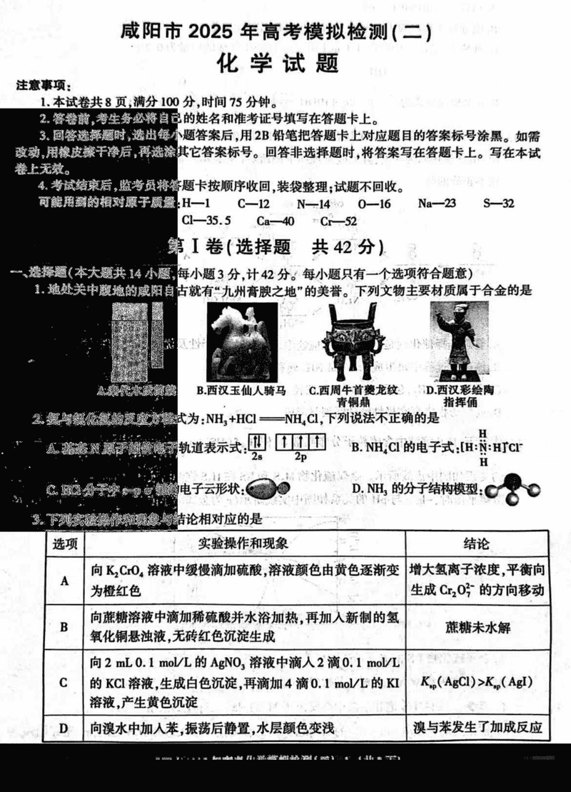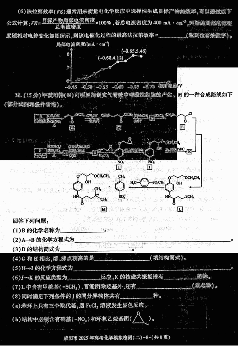 咸阳市2025年高考模拟检测(二)化学试题及答案 时间:2025-03-31 陕西 理综试题 咸阳市2025年高考模拟检测(二)化学考试已于近日开考,为方便考生考后及时查看考试情况,查漏补缺、弥补不足,本文整理了试题答案解析相关信息! 汇总:陕西省咸阳市2025届高三第二次模拟试题及答案汇总 化学试题及答案解析