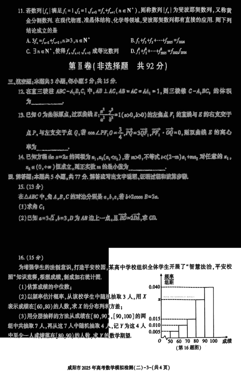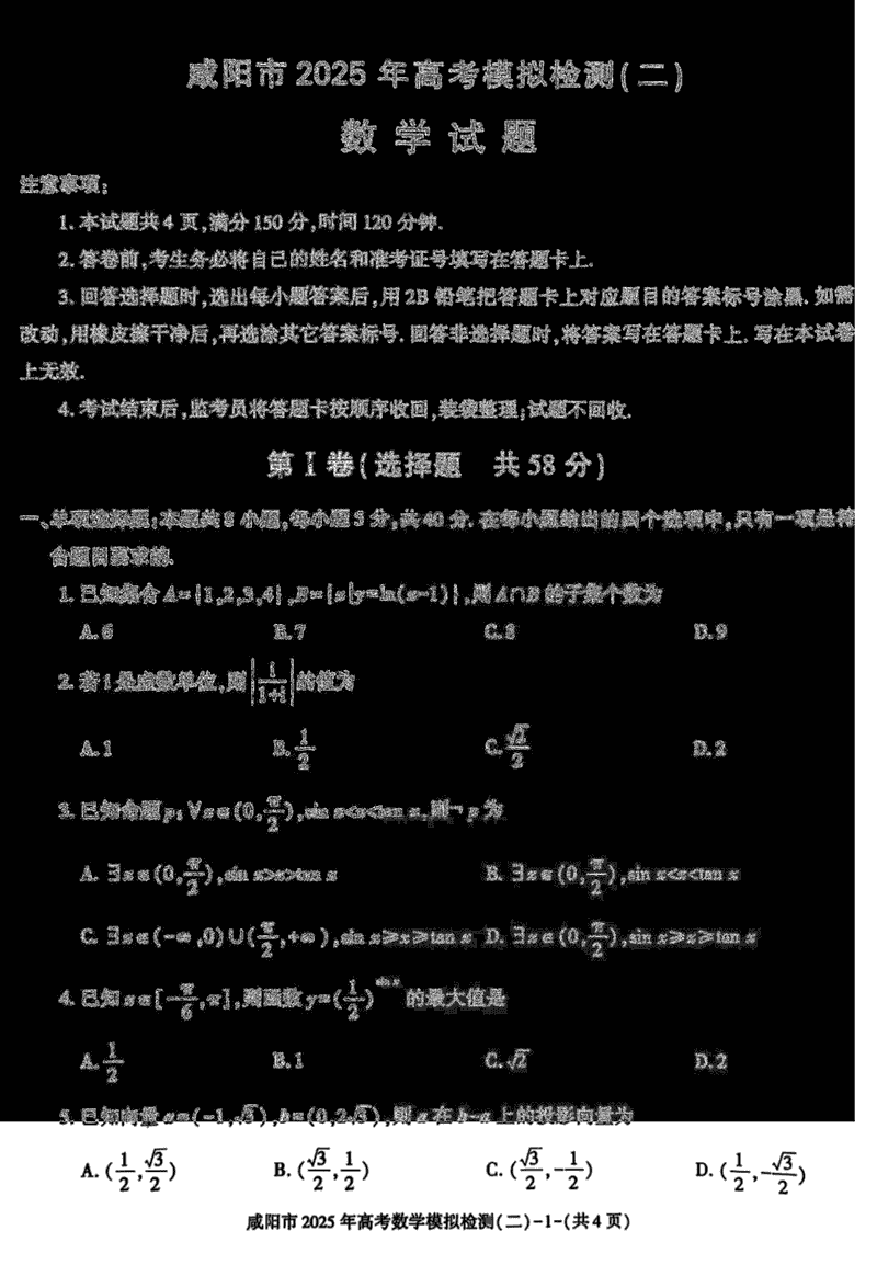 咸阳市2025年高考模拟检测(二)数学试题及答案 时间:2025-03-31 陕西 数学试题 咸阳市2025年高考模拟检测(二)数学考试已于近日开考,为方便考生考后及时查看考试情况,查漏补缺、弥补不足,本文整理了试题答案解析相关信息! 汇总:陕西省咸阳市2025届高三第二次模拟试题及答案汇总 数学试题及答案解析