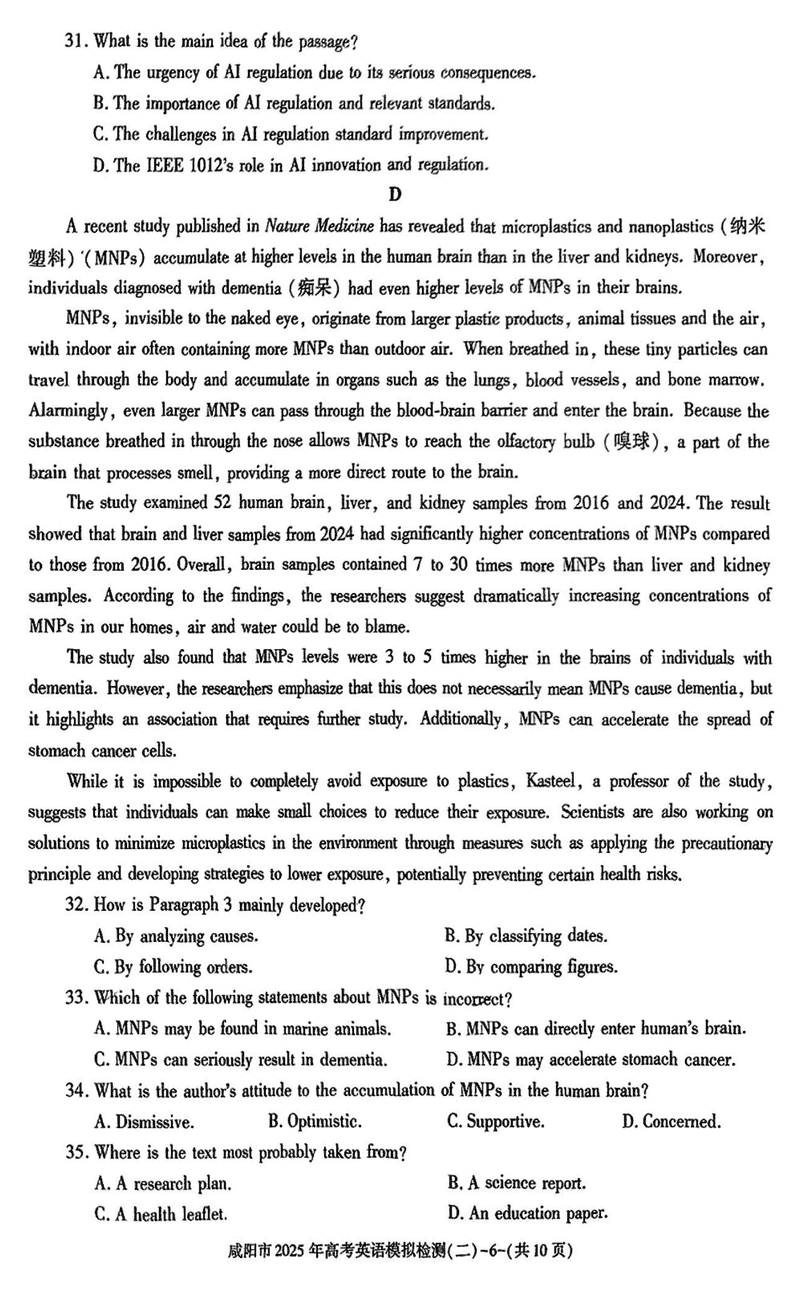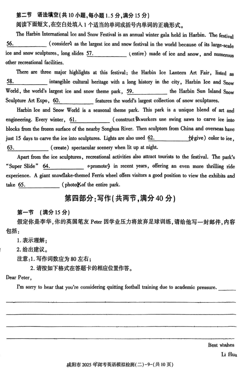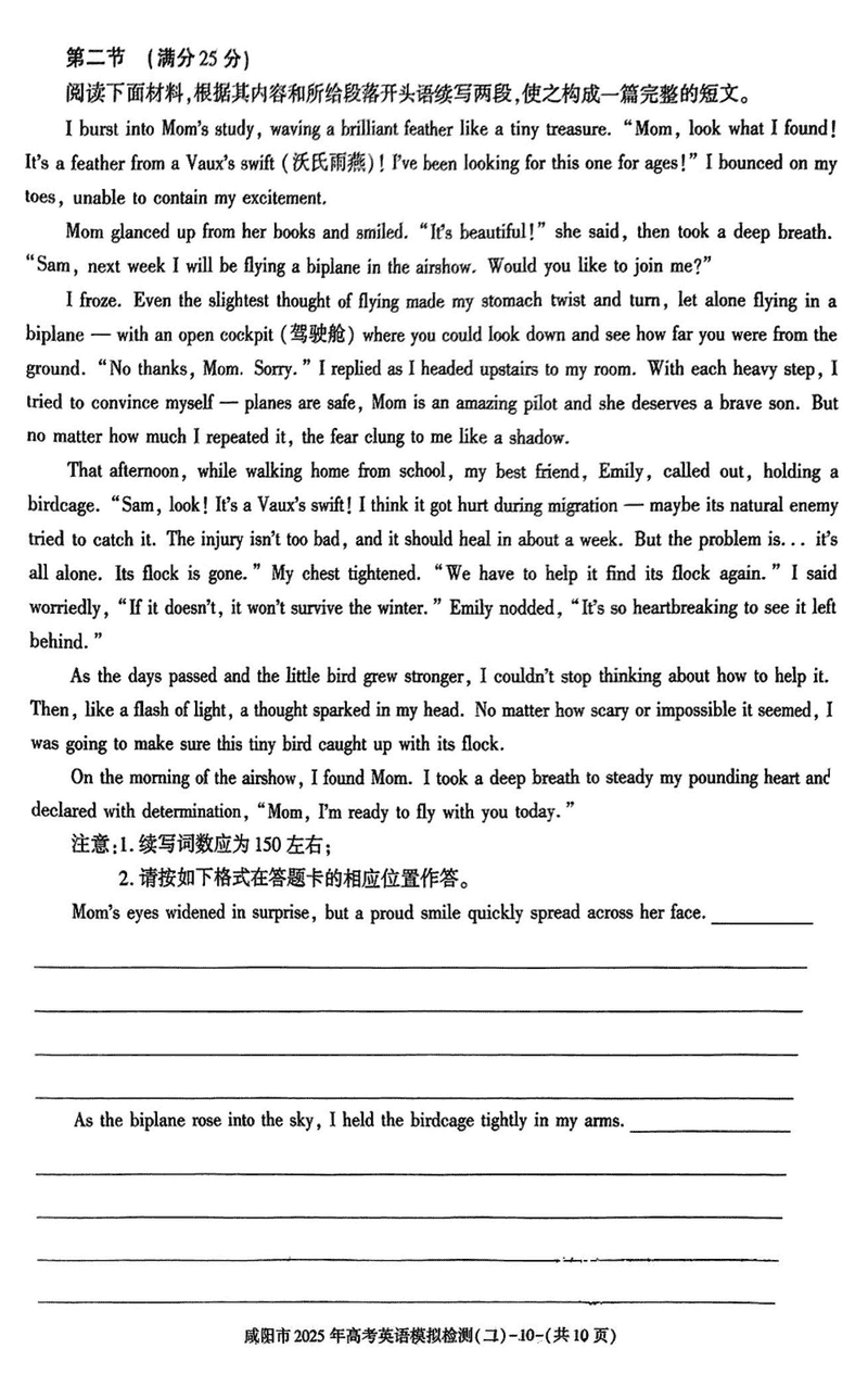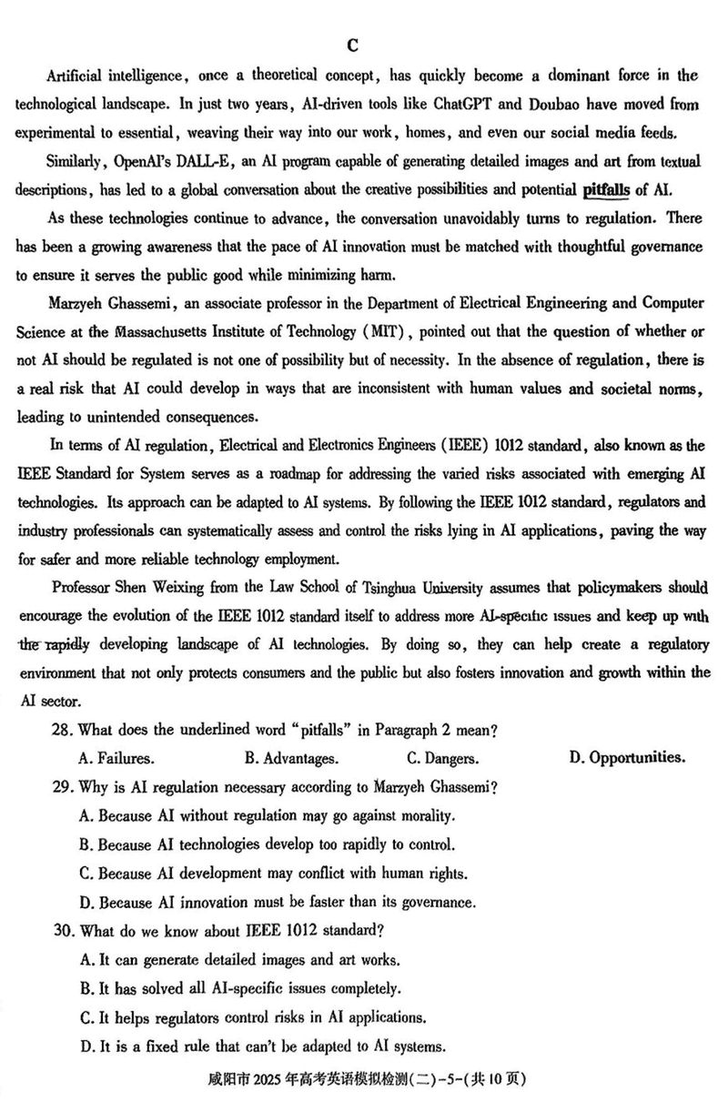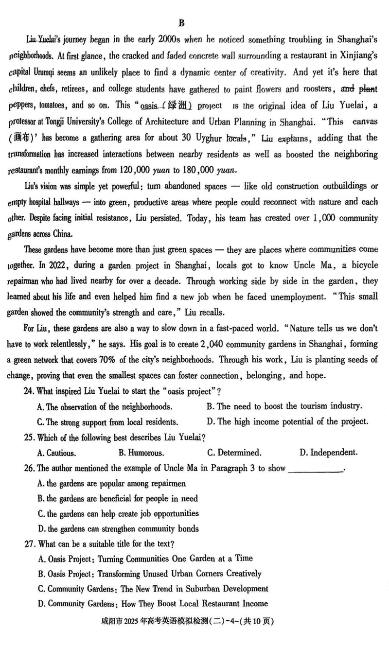 咸阳市2025年高考模拟检测(二)英语试题及答案 时间:2025-03-31 陕西 英语试题 咸阳市2025年高考模拟检测(二)英语考试已于近日开考,为方便考生考后及时查看考试情况,查漏补缺、弥补不足,本文整理了试题答案解析相关信息! 汇总:陕西省咸阳市2025届高三第二次模拟试题及答案汇总 英语试题及答案解析
