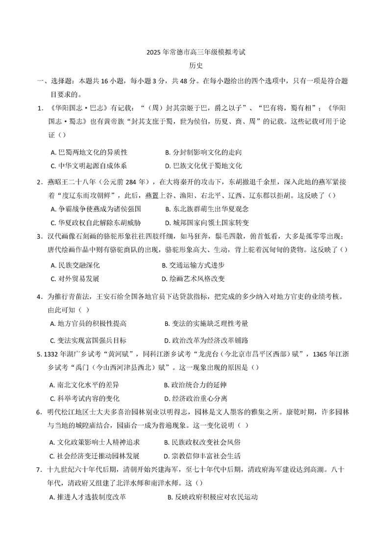 常德二模2025届高三下学期模考历史试题及答案 时间:2025-04-03 湖南 文综试题 常德二模2025届高三下学期模考历史考试已于近日开考,为方便考生考后及时查看考试情况,查漏补缺、弥补不足,本文整理了试题答案解析相关信息! 汇总:常德二模2025届高三下学期模拟考试试题及答案汇总 历史试题及答案解析
