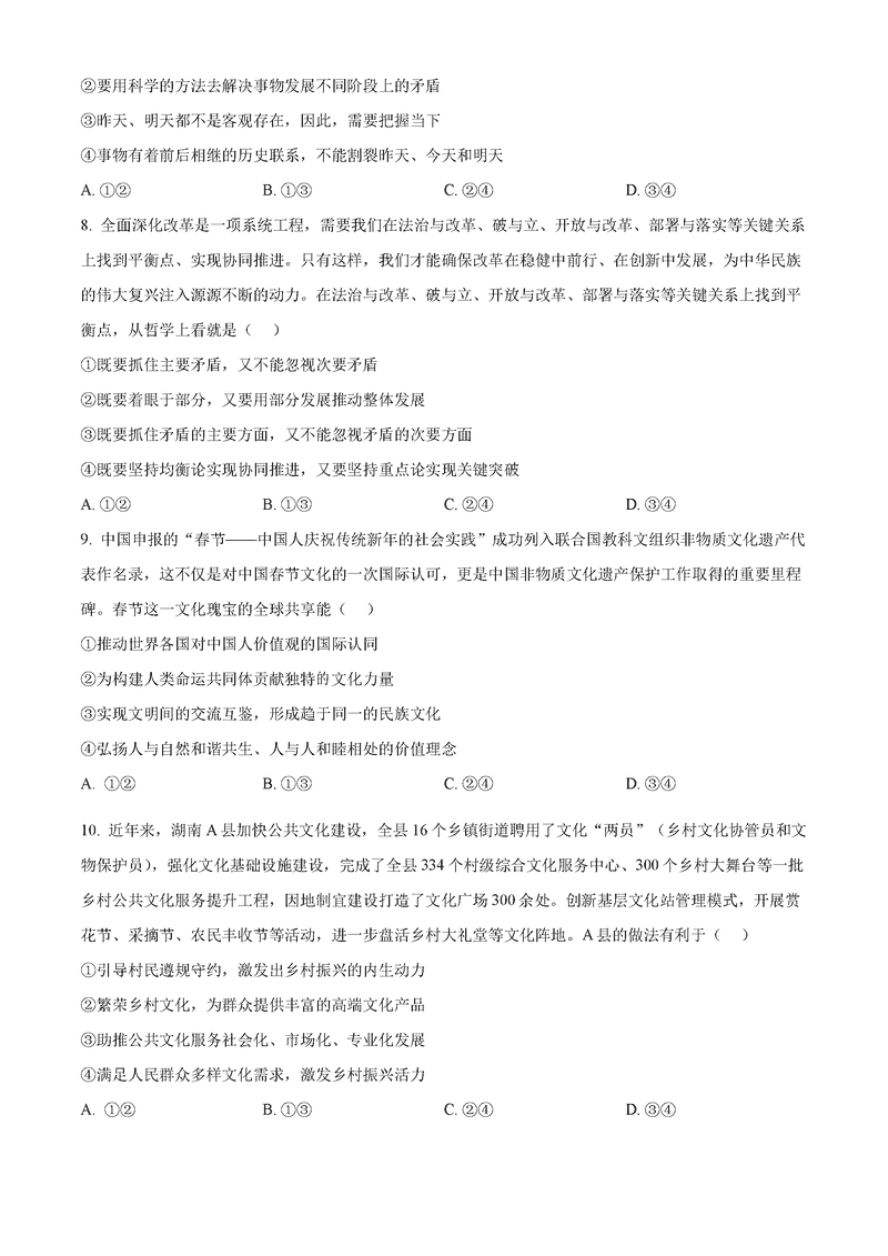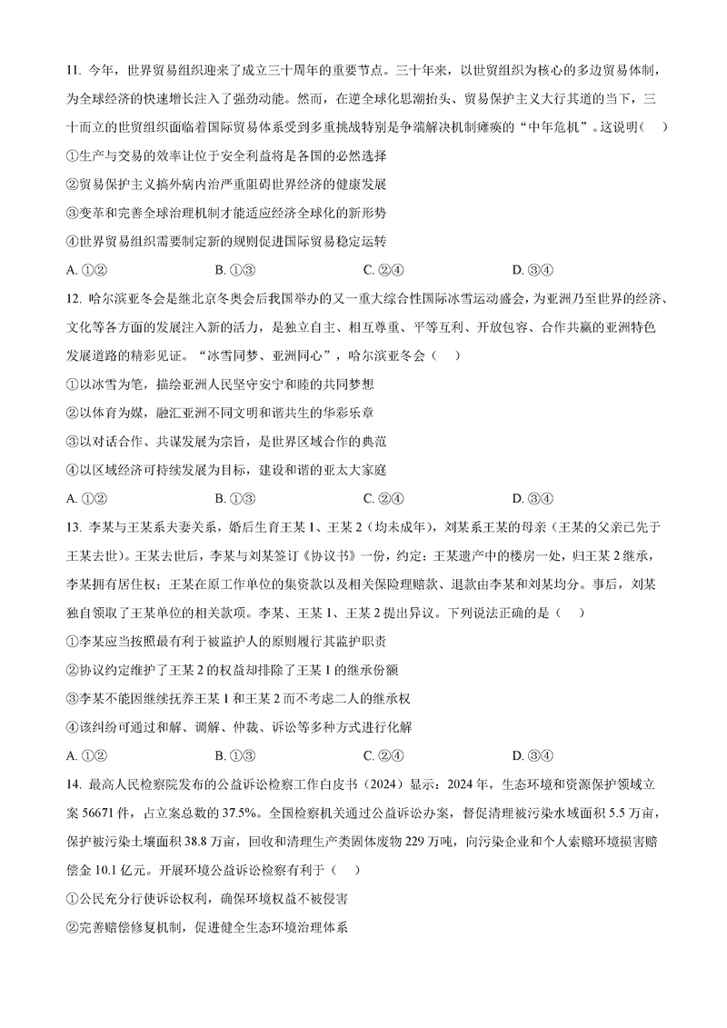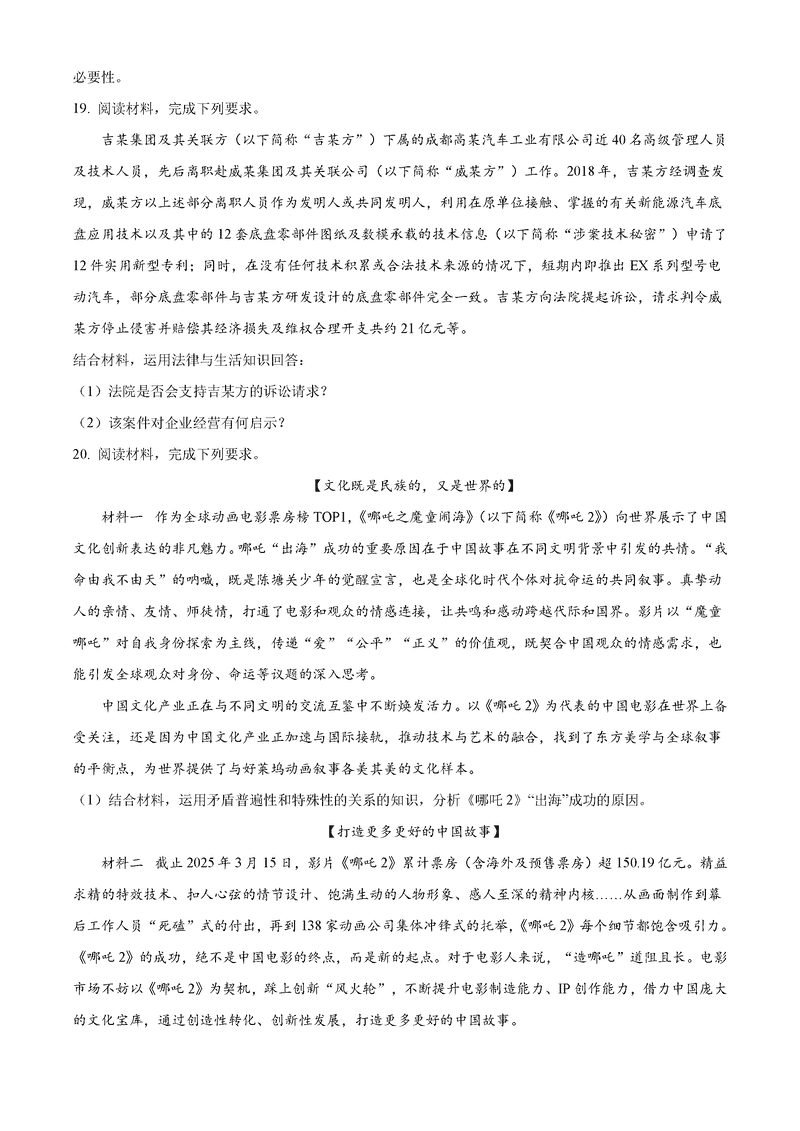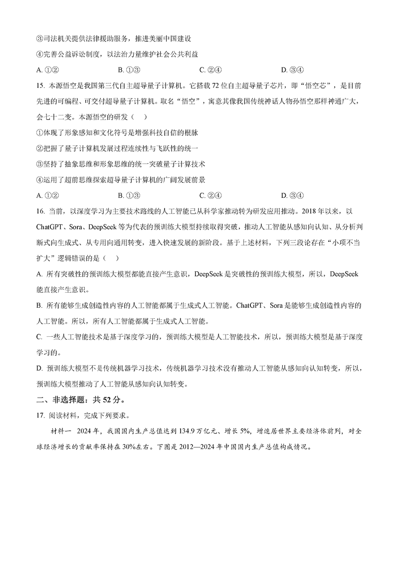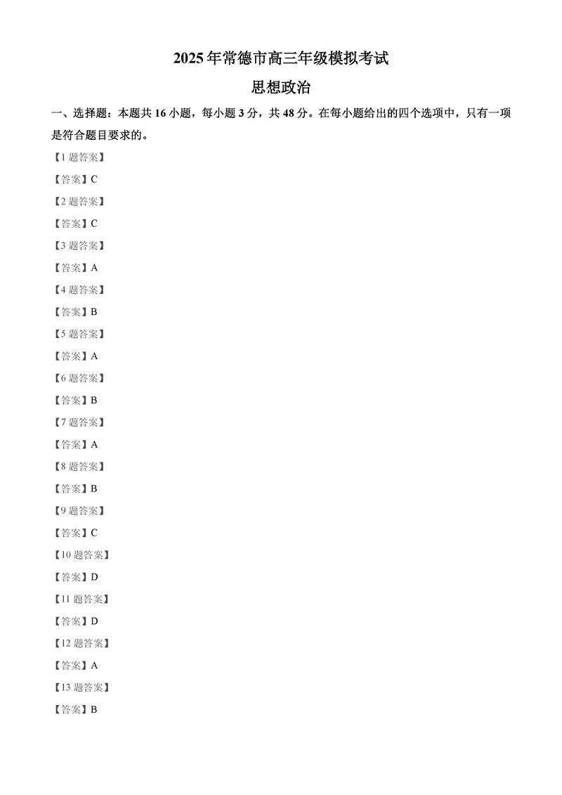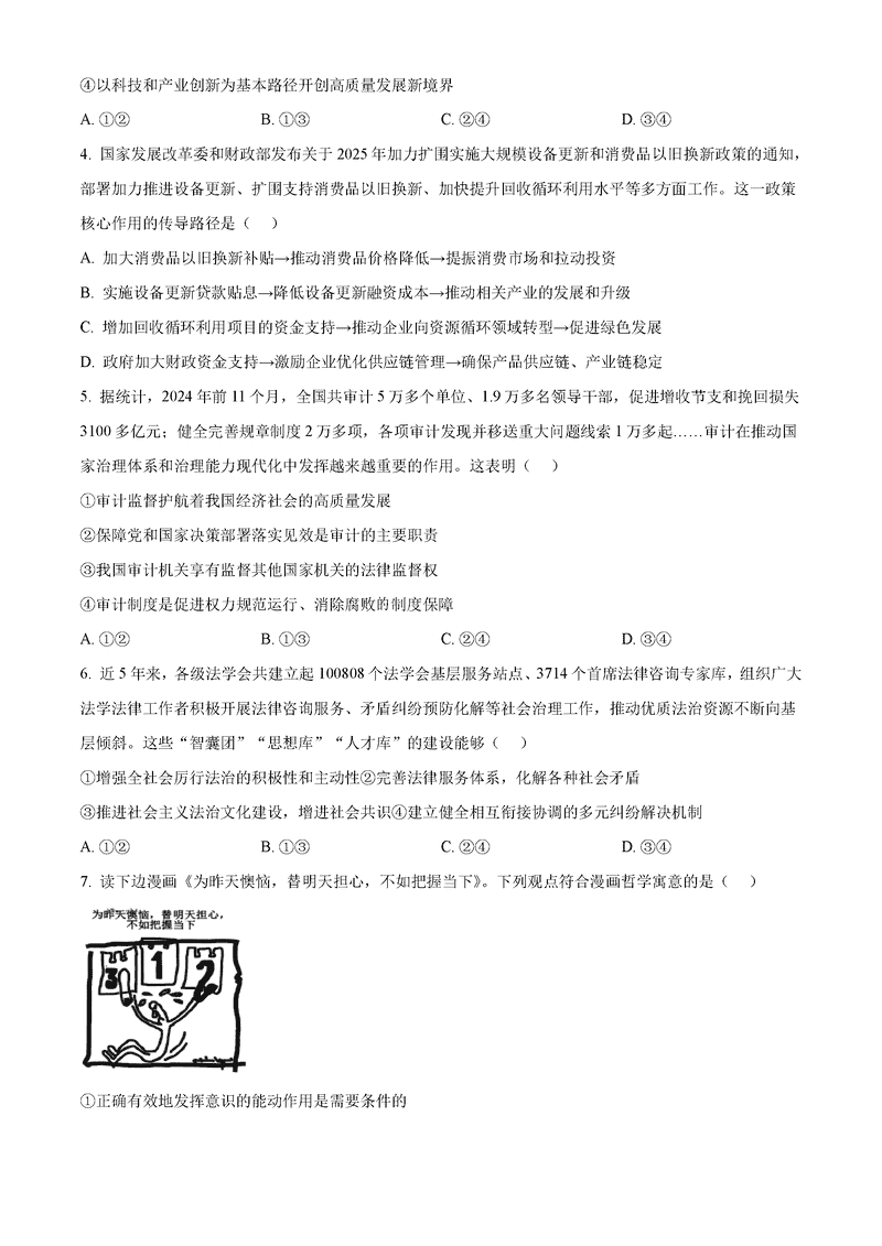 常德二模2025届高三下学期模考政治试题及答案 时间:2025-04-03 湖南 文综试题 常德二模2025届高三下学期模考政治考试已于近日开考,为方便考生考后及时查看考试情况,查漏补缺、弥补不足,本文整理了试题答案解析相关信息! 汇总:常德二模2025届高三下学期模拟考试试题及答案汇总 政治试题及答案解析