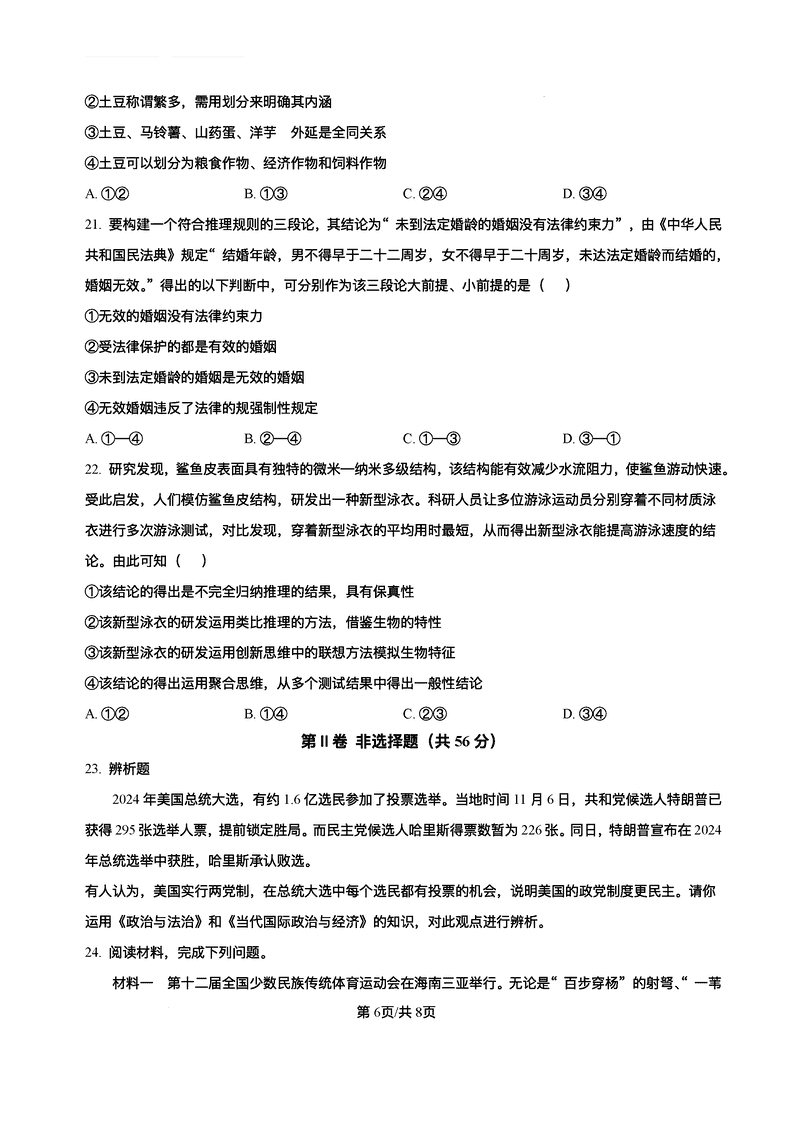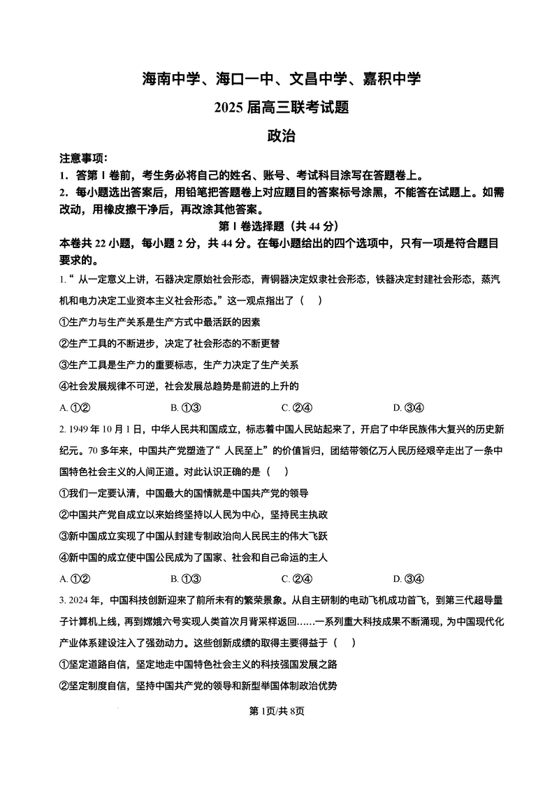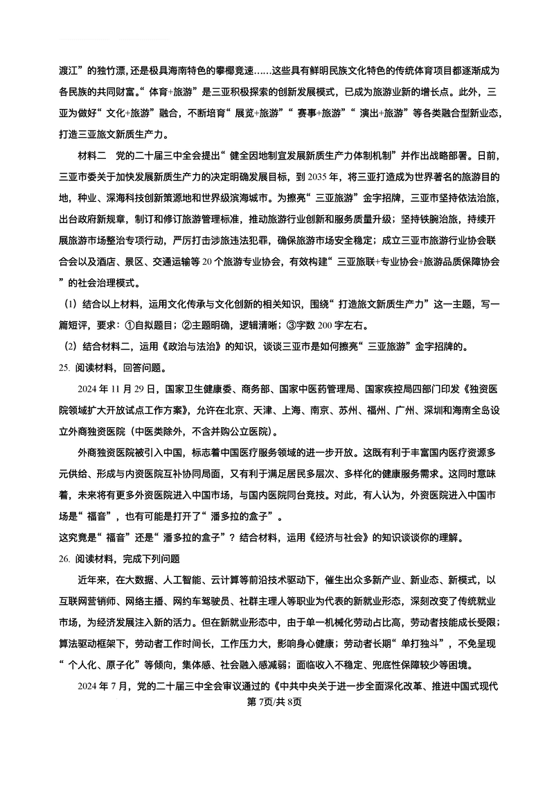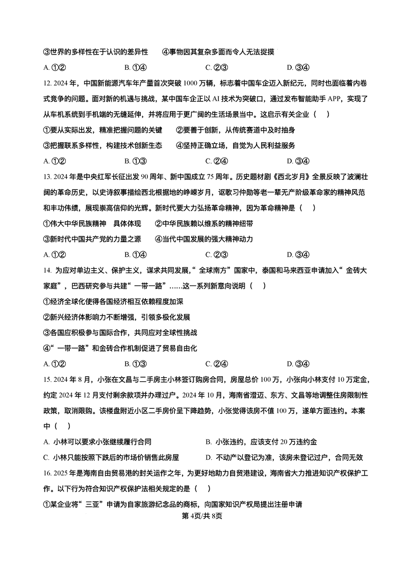 2025届海南中学等四校高三下学期模拟联考政治试题及答案