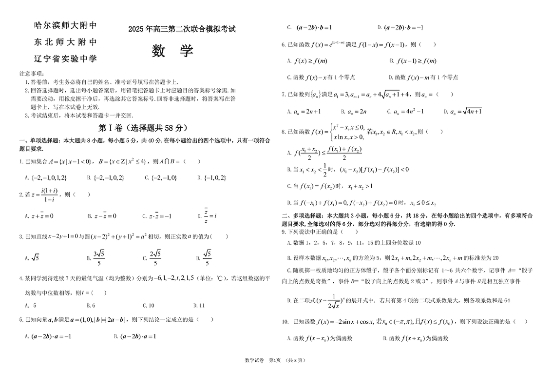 东北三省三校2025届高三二模数学试题及答案