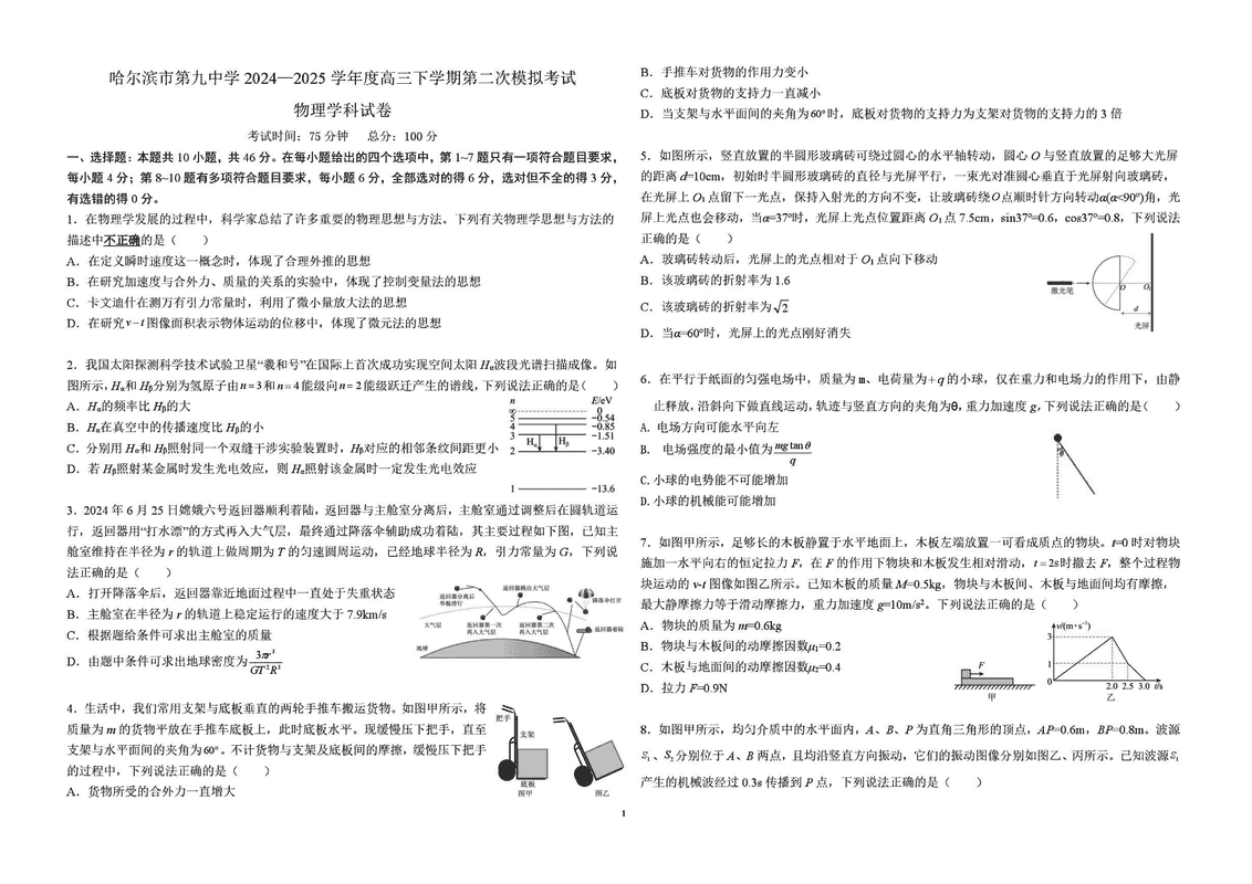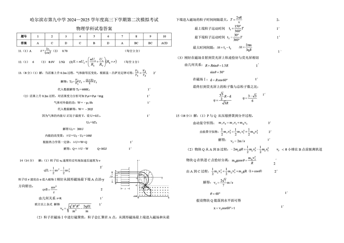 哈九中2025届高三下学期第二次模考物理试题及答案