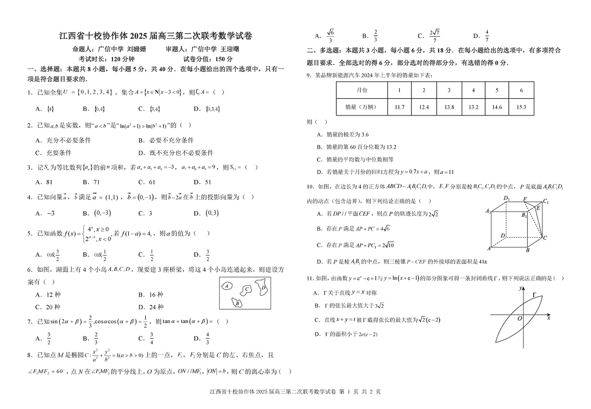 江西省十校协作体2025届高三第二次联考数学试题及答案