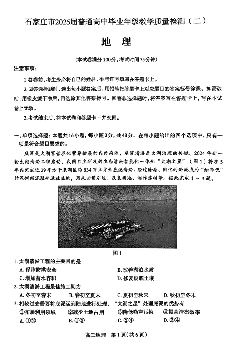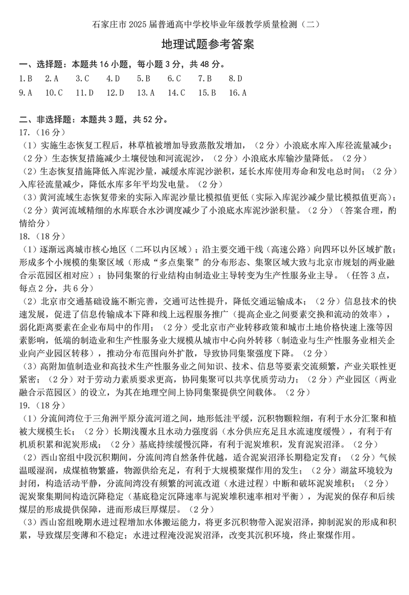 2025届石家庄市高三质检(二)地理试题及答案