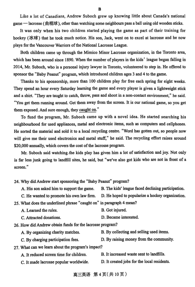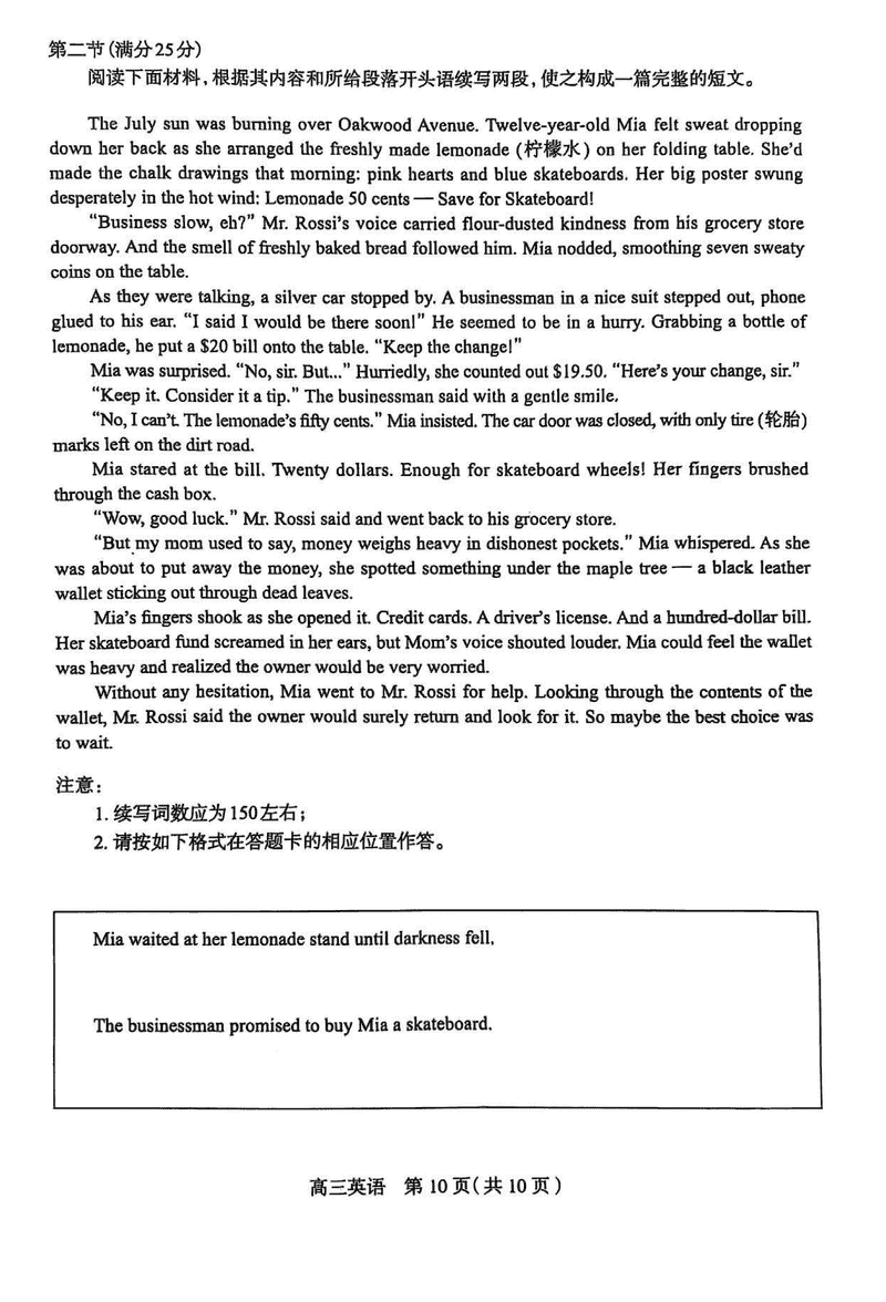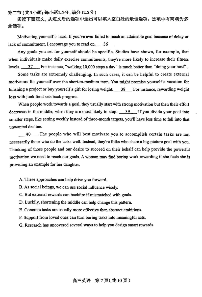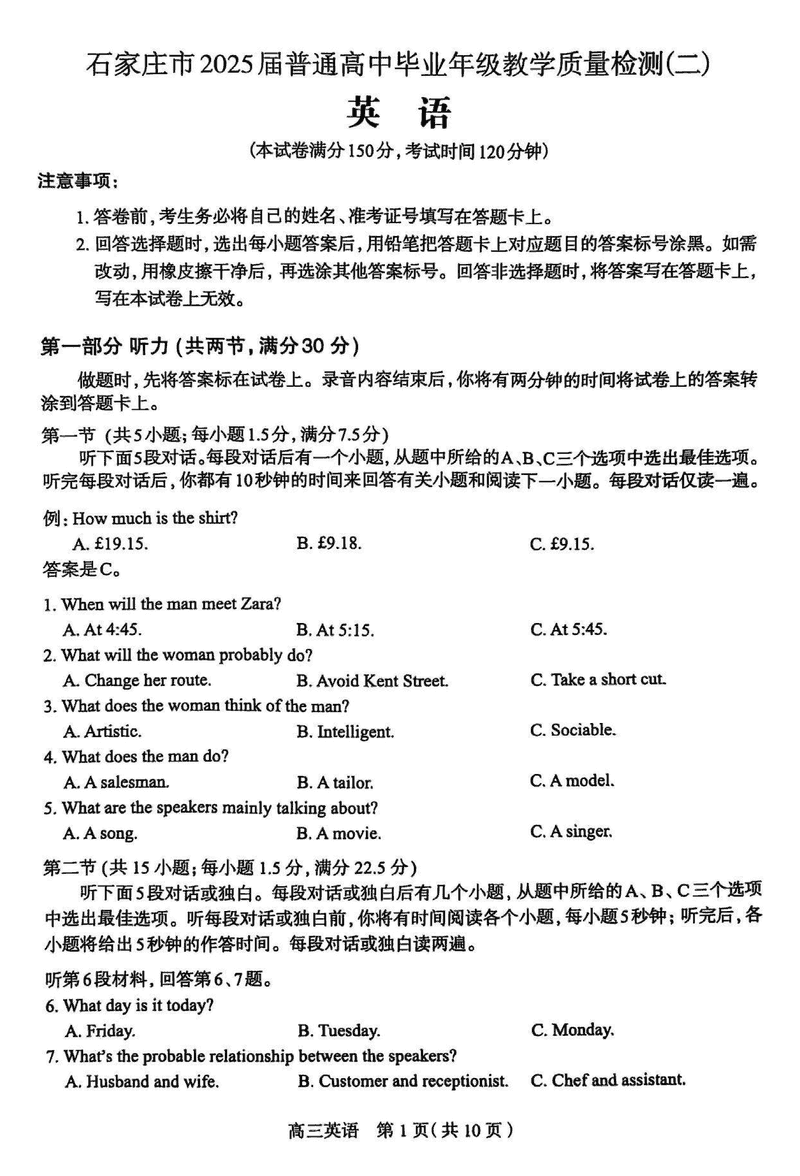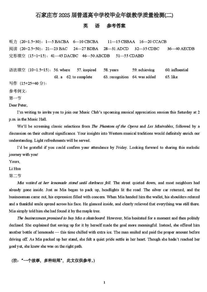 2025届石家庄市高三质检(二)英语试题及答案