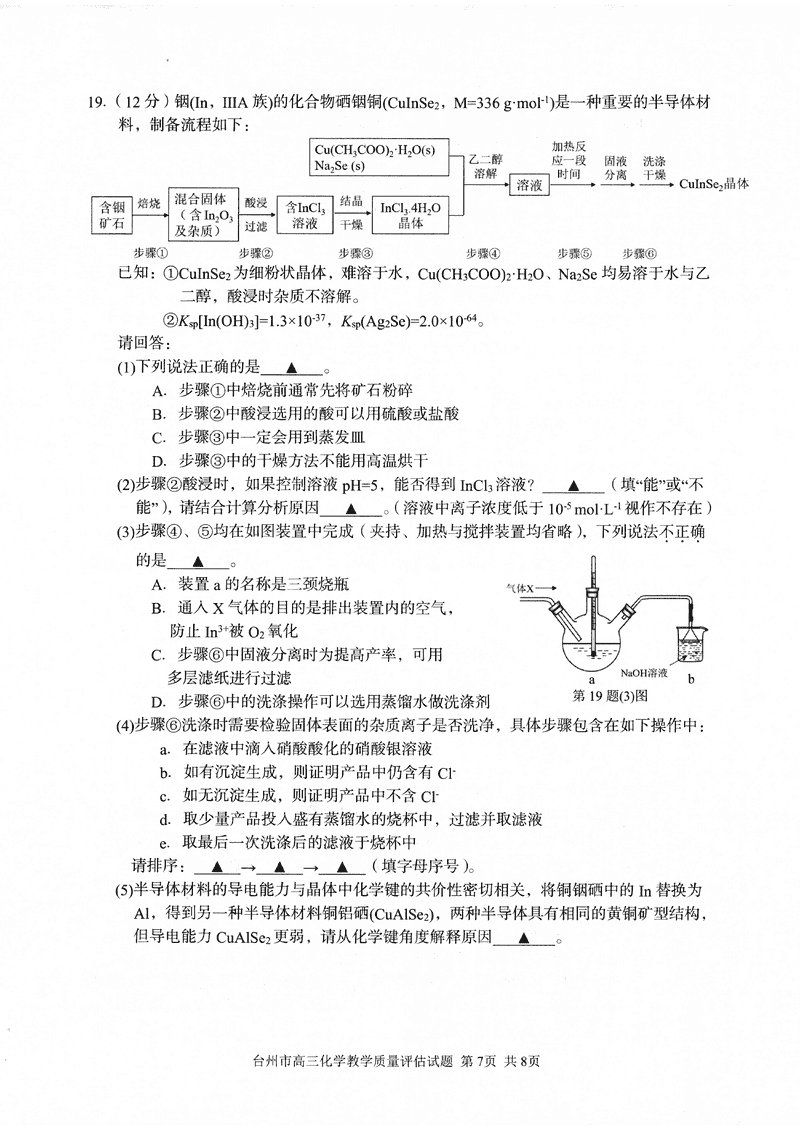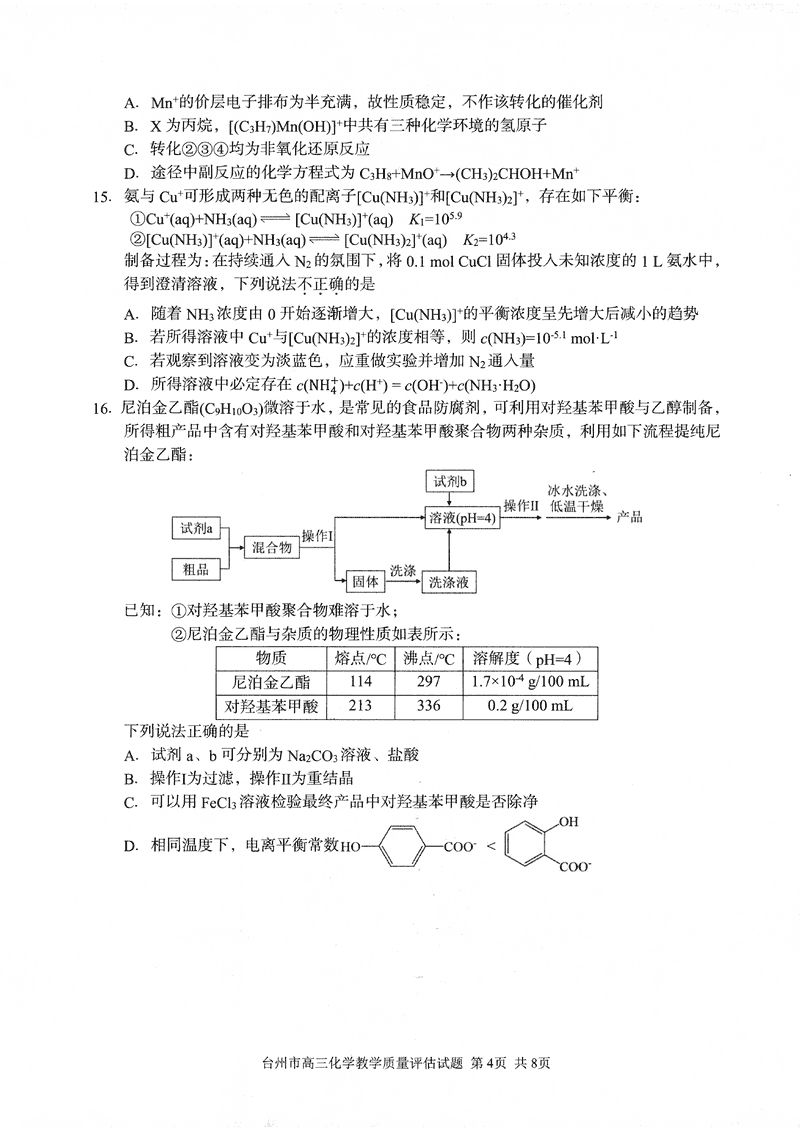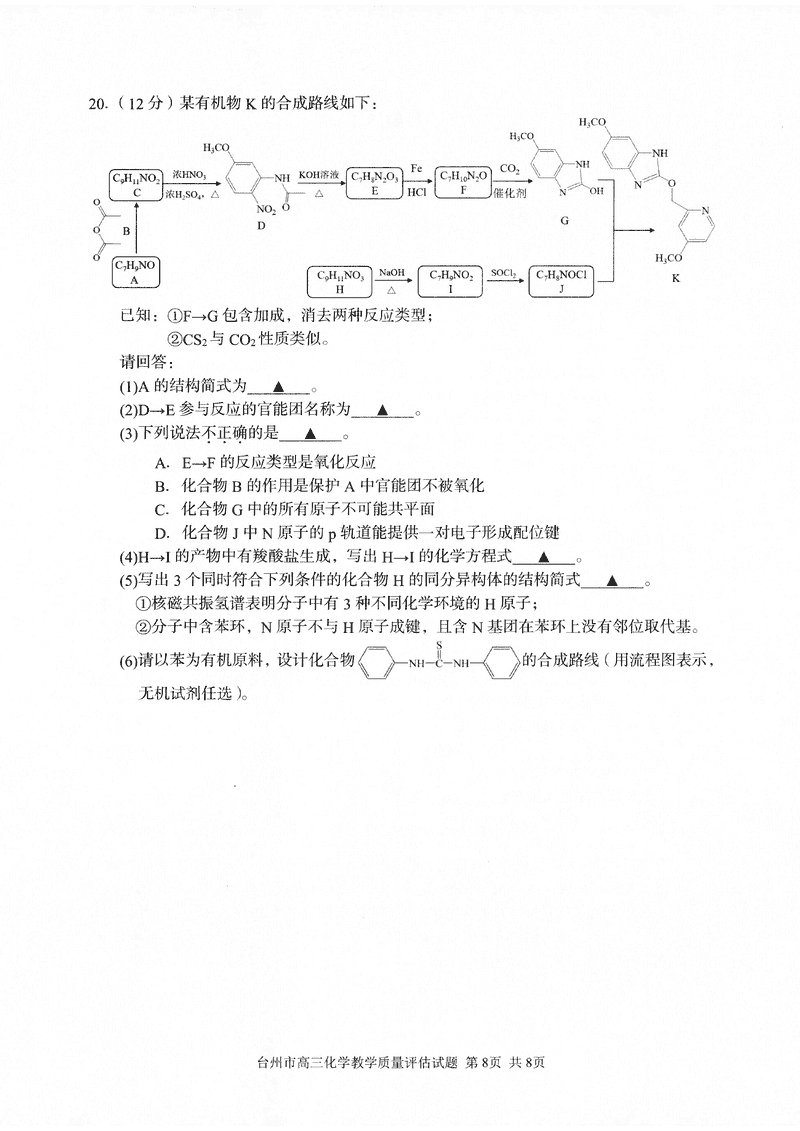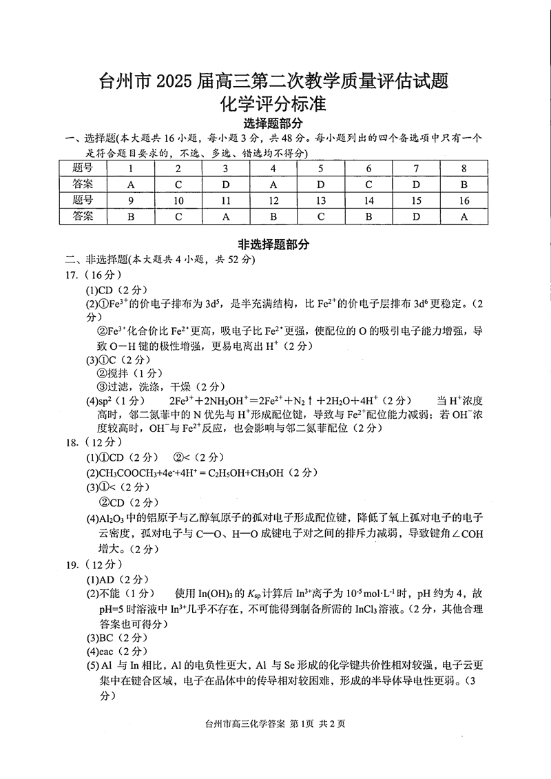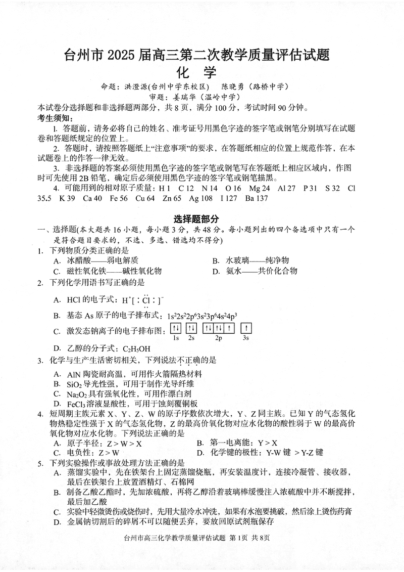 台州2025届4月高三下学期二模化学试题及答案 时间:2025-04-12 浙江 理综试题 浙江台州2025届4月高三下学期二模化学考试已于近日开考,为方便考生考后及时查看考试情况,查漏补缺、弥补不足,本文整理了试题答案解析相关信息! 汇总:浙江台州2025届4月高三下学期二模试题及答案汇总 化学试题及答案解析