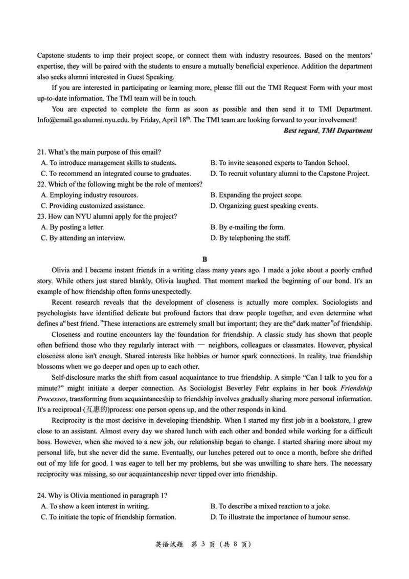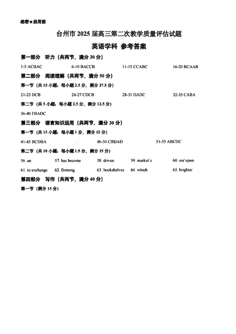 台州2025届4月高三下学期二模英语试题及答案 时间:2025-04-12 浙江 英语试题 浙江台州2025届4月高三下学期二模英语考试已于近日开考,为方便考生考后及时查看考试情况,查漏补缺、弥补不足,本文整理了试题答案解析相关信息! 汇总:浙江台州2025届4月高三下学期二模试题及答案汇总 英语试题及答案解析