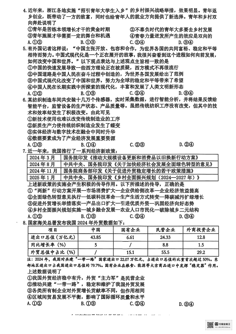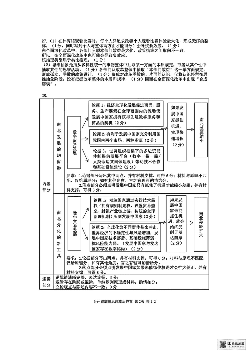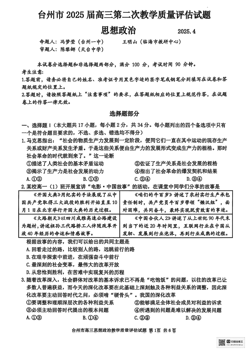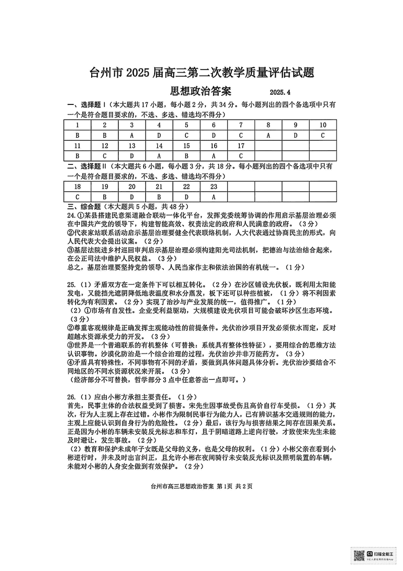 台州2025届4月高三下学期二模政治试题及答案 时间:2025-04-12 浙江 文综试题 浙江台州2025届4月高三下学期二模政治考试已于近日开考,为方便考生考后及时查看考试情况,查漏补缺、弥补不足,本文整理了试题答案解析相关信息! 汇总:浙江台州2025届4月高三下学期二模试题及答案汇总 政治试题及答案解析
