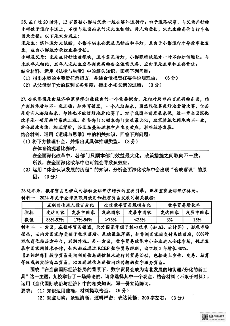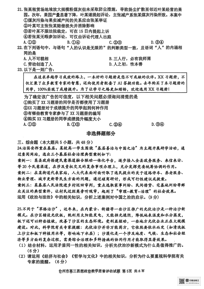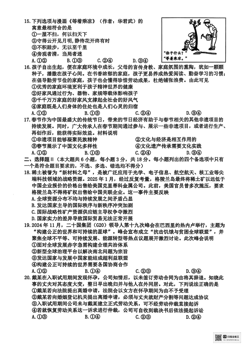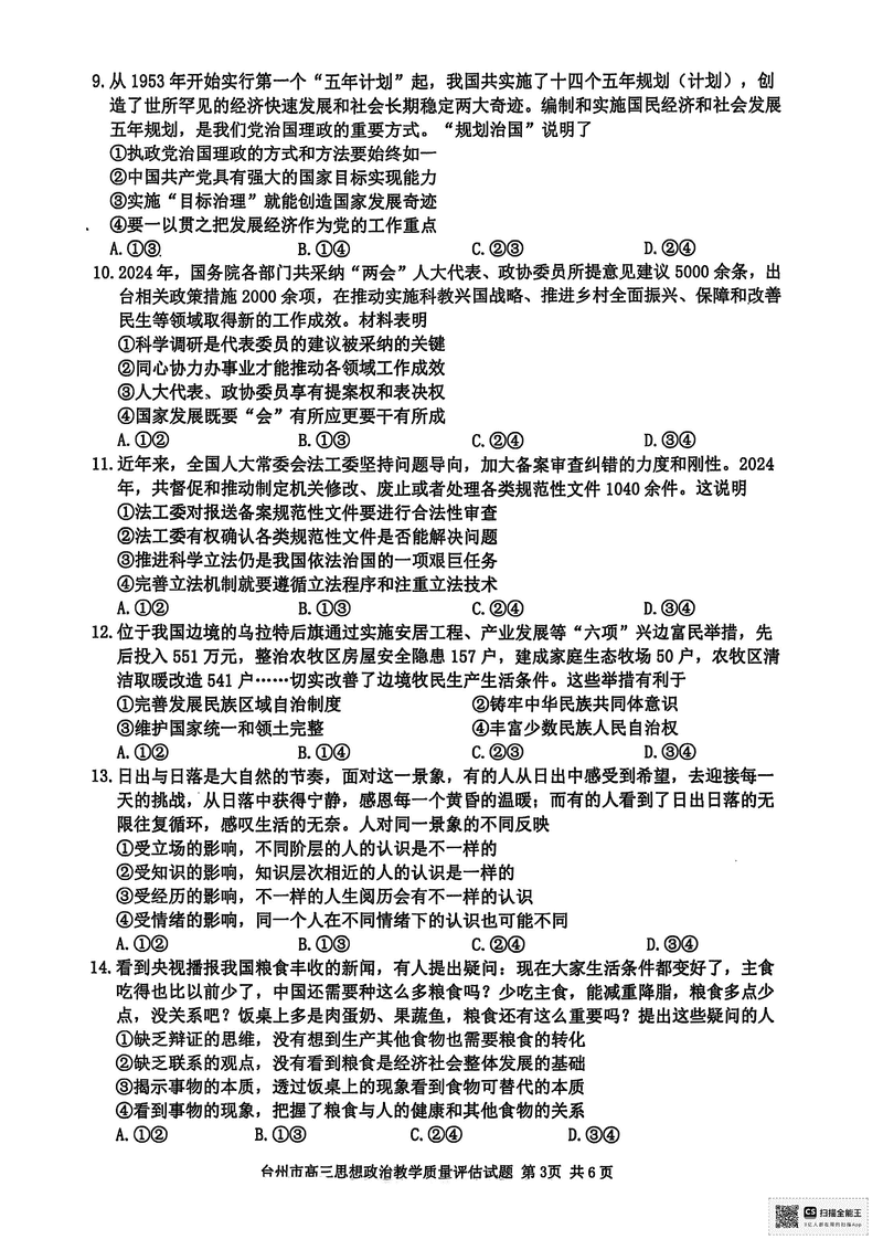 台州2025届4月高三下学期二模政治试题及答案 时间:2025-04-12 浙江 文综试题 浙江台州2025届4月高三下学期二模政治考试已于近日开考,为方便考生考后及时查看考试情况,查漏补缺、弥补不足,本文整理了试题答案解析相关信息! 汇总:浙江台州2025届4月高三下学期二模试题及答案汇总 政治试题及答案解析