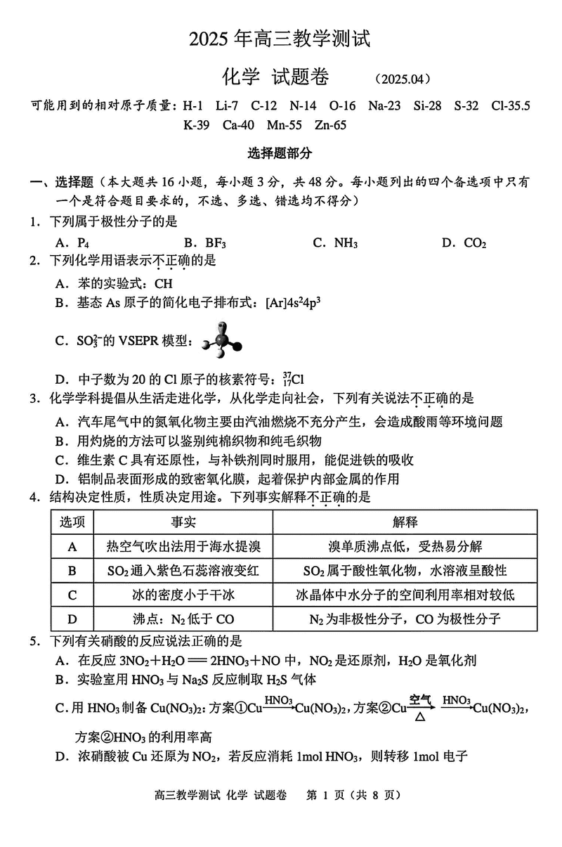 嘉兴二模2025届高三下学期4月教学测试化学考试已于近日开考,为方便考生考后及时查看考试情况,查漏补缺、弥补不足,本文整理了试题答案解析相关信息!