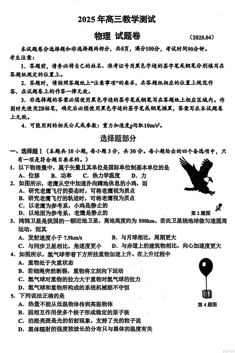 嘉兴二模2025届高三下学期4月教学测试物理试题及答案