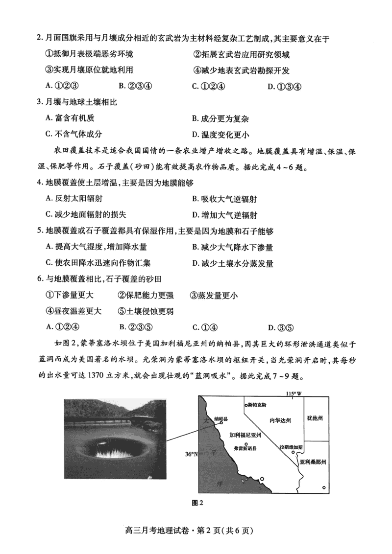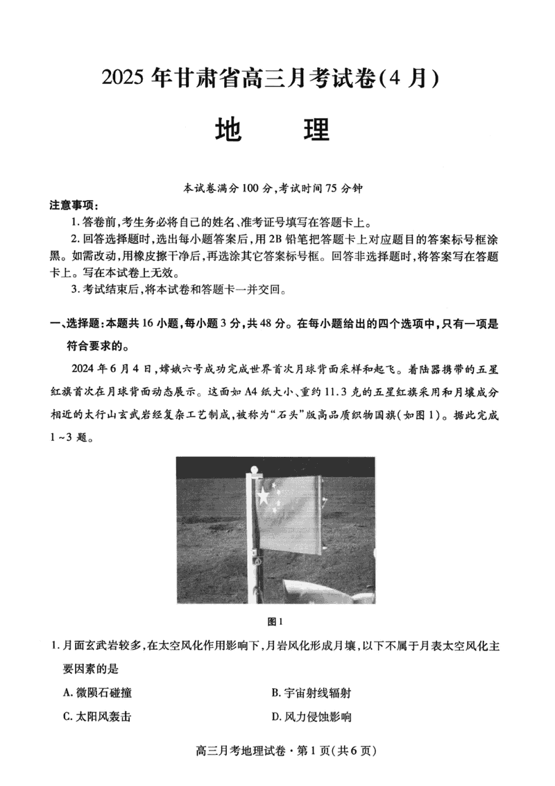 甘肃二诊2025年高三4月月考地理试题及答案 时间:2025-04-12 甘肃 文综试题 甘肃二诊2025年高三4月月考地理考试已于近日开考,为方便考生考后及时查看考试情况,查漏补缺、弥补不足,本文整理了试题答案解析相关信息! 汇总:甘肃二诊2025年高三4月联考试题及答案汇总 地理试题及答案解析