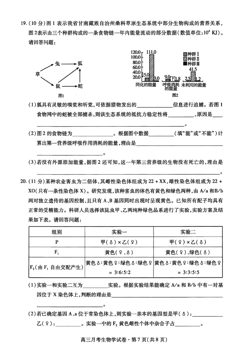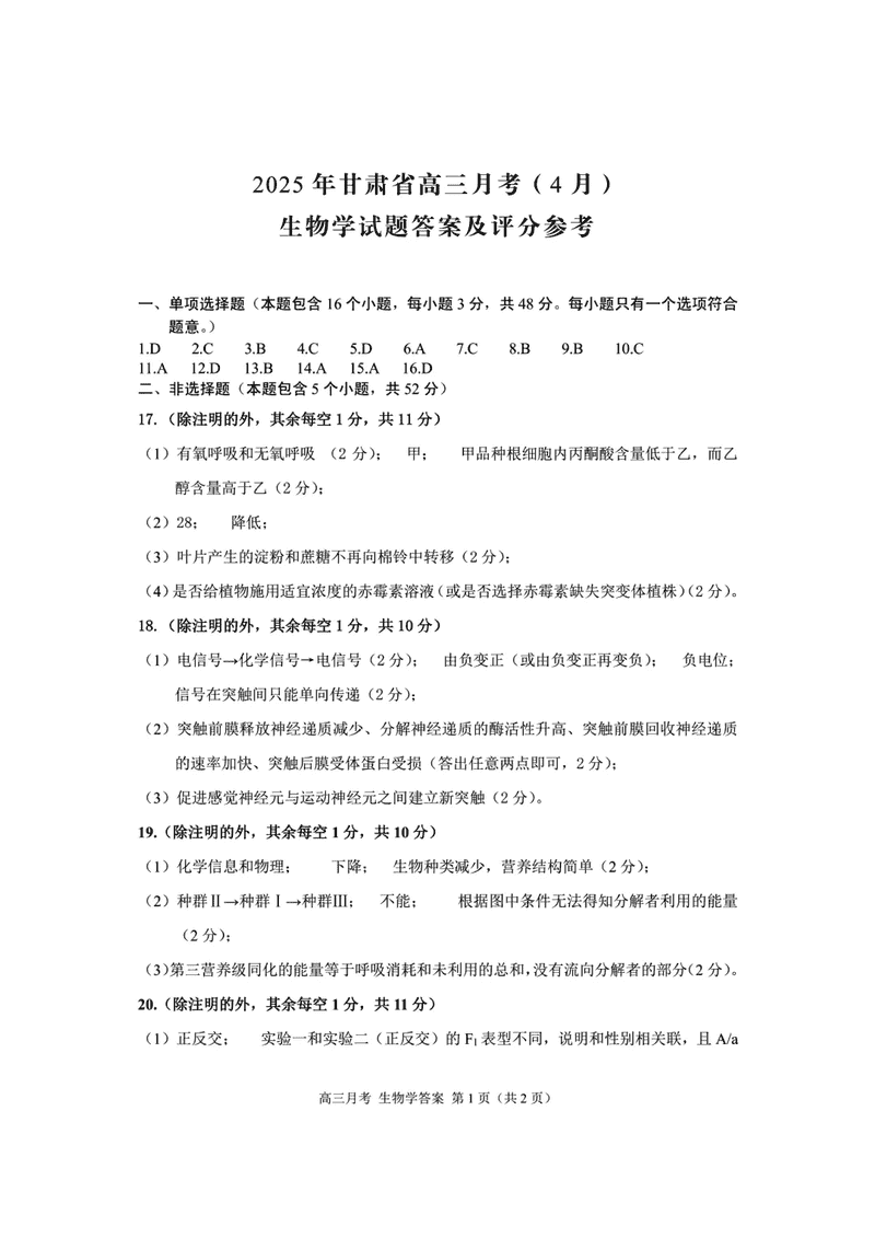 甘肃二诊2025年高三4月月考生物试题及答案 时间:2025-04-12 甘肃 理综试题 甘肃二诊2025年高三4月月考生物考试已于近日开考,为方便考生考后及时查看考试情况,查漏补缺、弥补不足,本文整理了试题答案解析相关信息! 汇总:甘肃二诊2025年高三4月联考试题及答案汇总 生物试题及答案解析