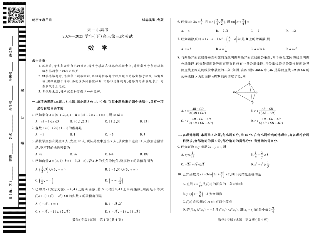 陕西山西天一小高考2025年(下)高三第三次数学考试已于近日开考,为方便考生考后及时查看考试情况,查漏补缺、弥补不足,本文整理了试题答案解析相关信息!