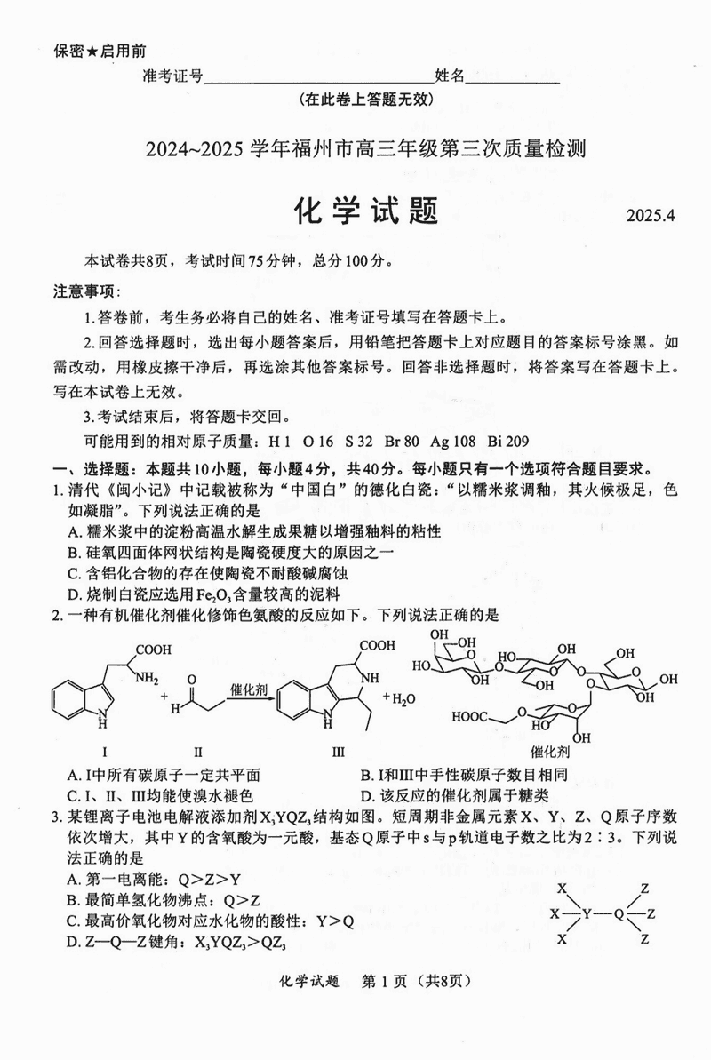 福建2025年4月高三九市联考化学试题及答案 时间:2025-04-12 福建 理综试题 福建2025年4月高三九市联考化学考试已于近日开考,为方便考生考后及时查看考试情况,查漏补缺、弥补不足,本文整理了试题答案解析相关信息! 汇总:福建2025年4月高三九市联考试题及答案汇总 化学试题及答案解析