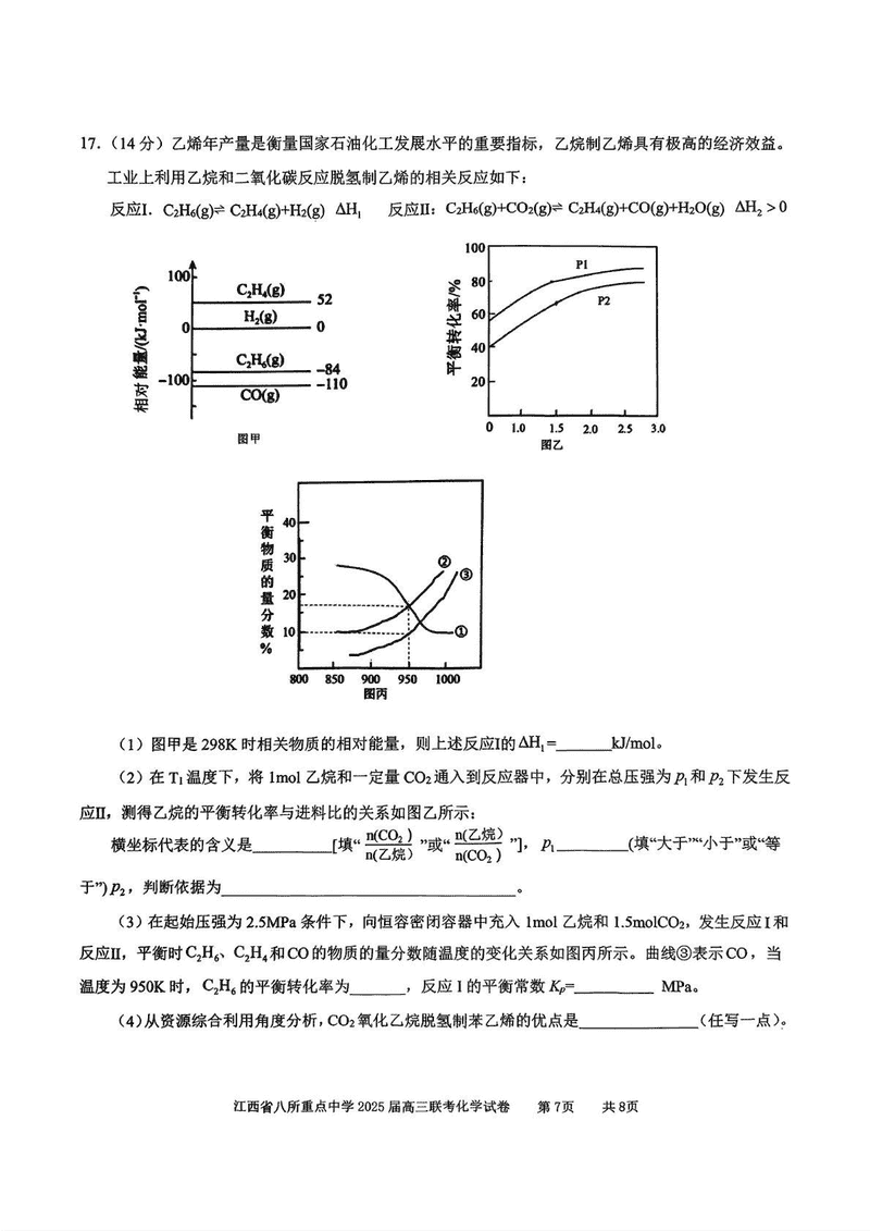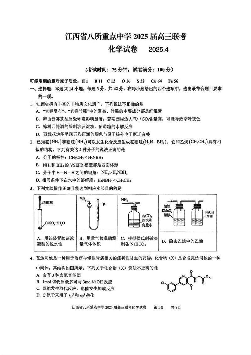 江西省八所重点中学2025届高三4月联考化学试题及答案