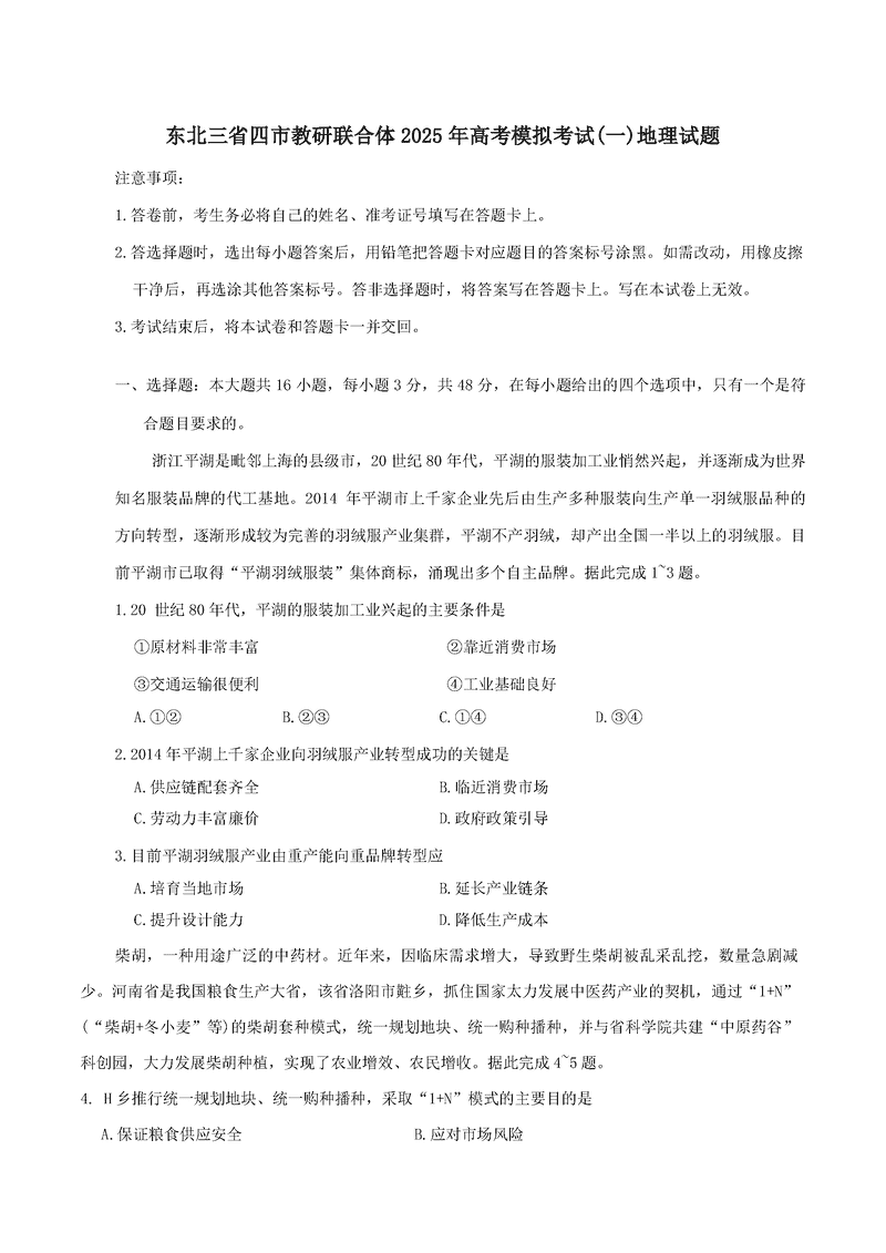 2025年东北三省四市教研联合体高考模拟考试(一)地理试题及答案