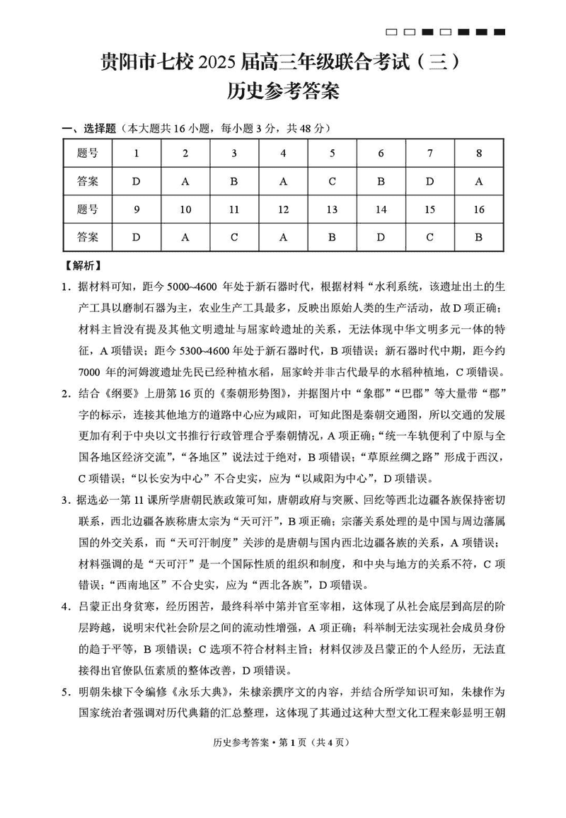 贵阳市七校2025届高三下学期联考(三)历史考试已于近日开考,为方便考生考后及时查看考试情况,查漏补缺、弥补不足,本文整理了试题答案解析相关信息!