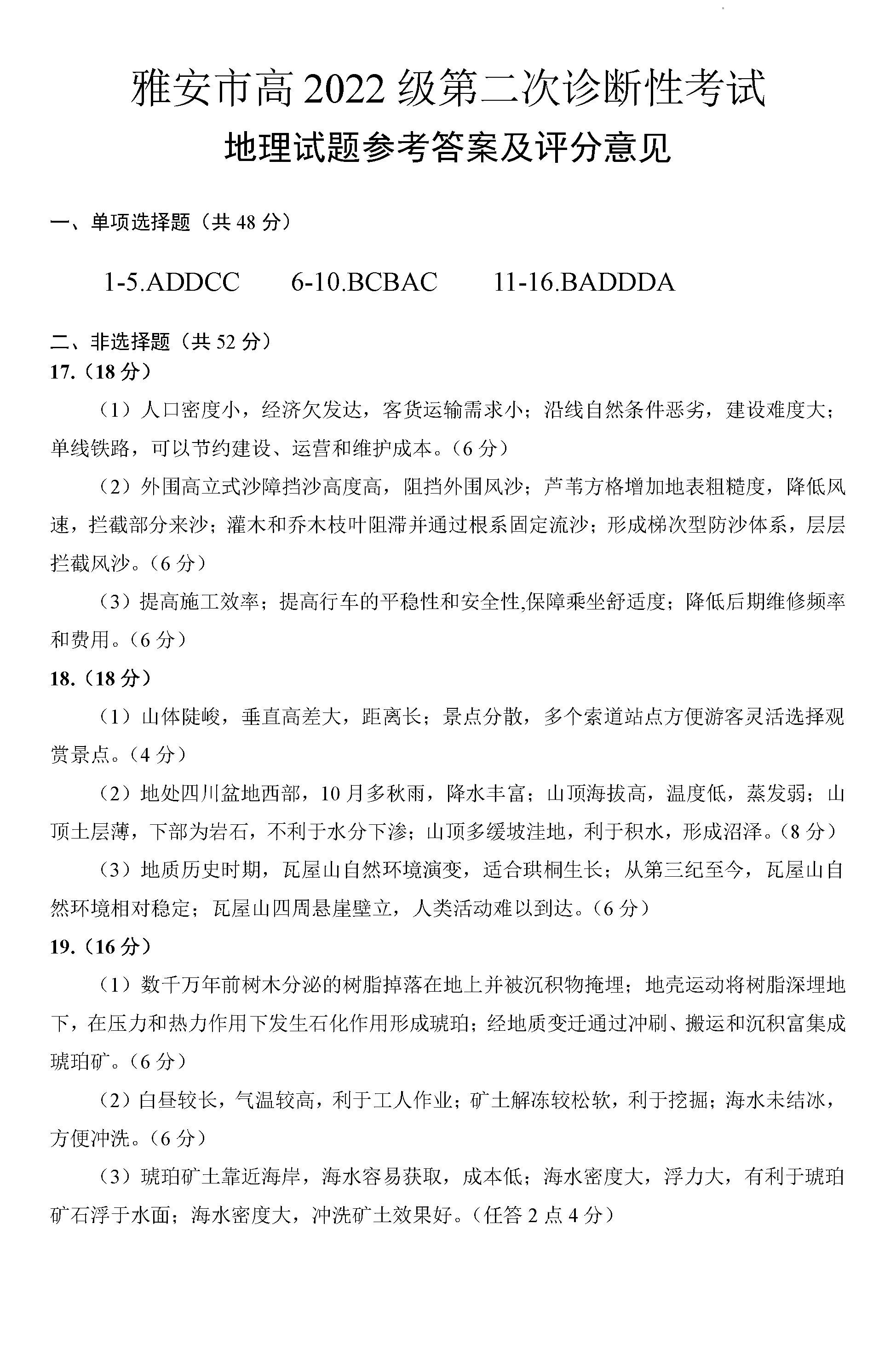 雅安市2025届高三下学期第二次诊断性地理试题及答案
