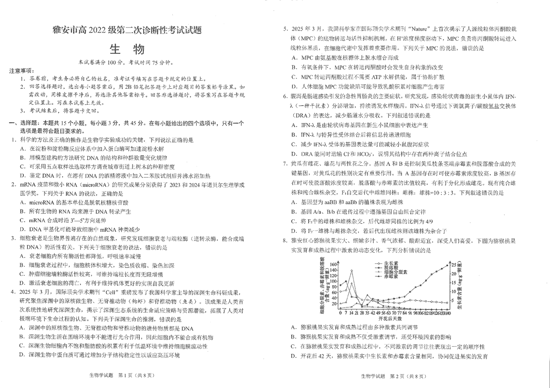 雅安市2025届高三下学期第二次诊断性生物考试已于近日开考,为方便考生考后及时查看考试情况,查漏补缺、弥补不足,本文整理了试题答案解析相关信息!