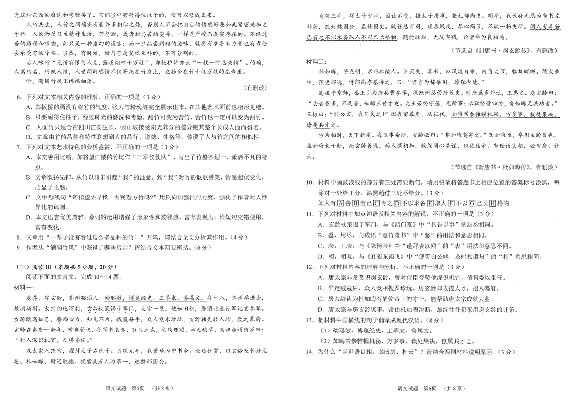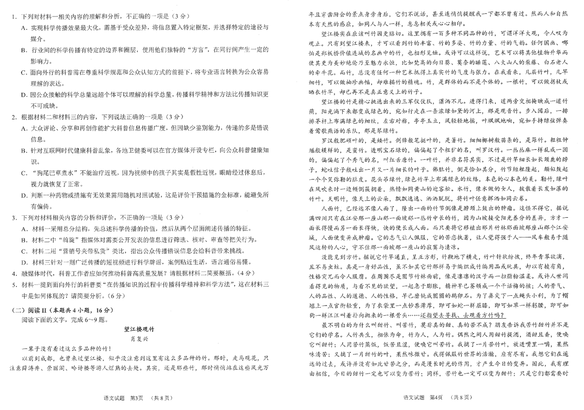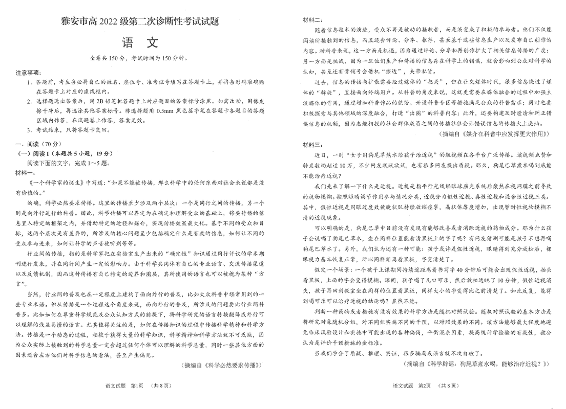 雅安市2025届高三下学期第二次诊断性语文试题及答案