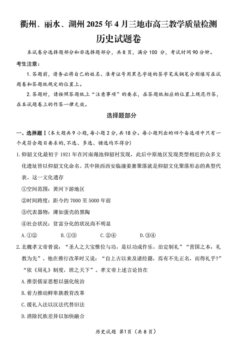 衢州、丽水、湖州三地市二模2025年4月高三教学质检历史考试已于近日开考,为方便考生考后及时查看考试情况,查漏补缺、弥补不足,本文整理了试题答案解析相关信息!