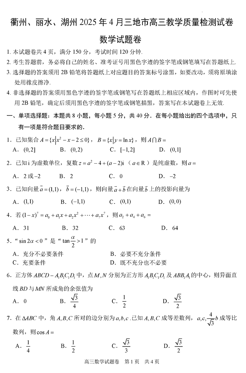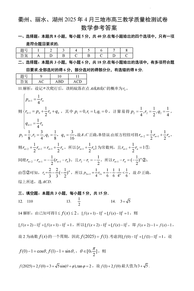 衢州、丽水、湖州三地市二模2025年4月高三教学质检数学试题及答案