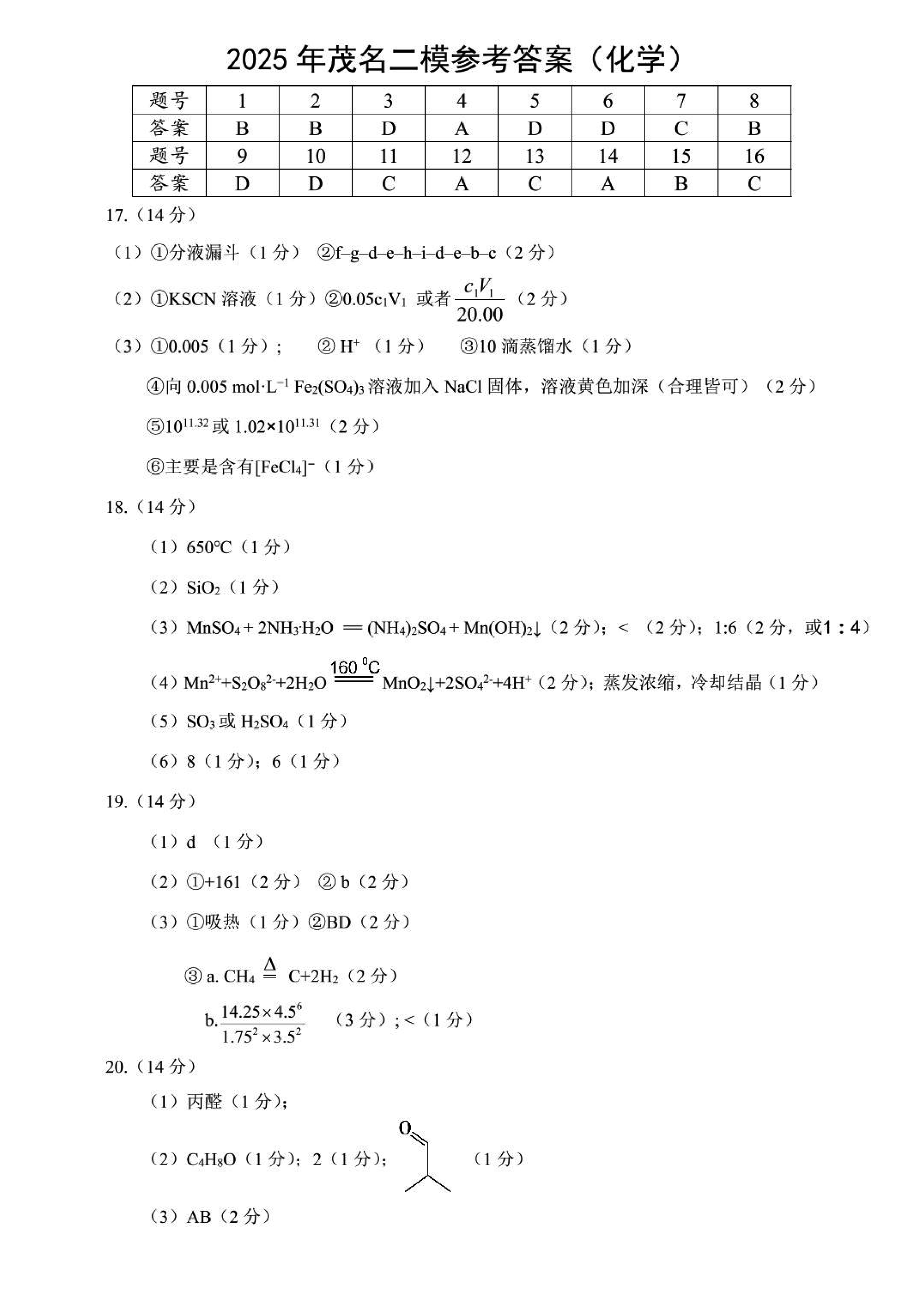 茂名二模2025年高三第二次综合测试化学试题及答案 时间:2025-04-15 广东 理综试题 茂名二模2025年高三第二次综合测试化学考试已于近日开考,为方便考生考后及时查看考试情况,查漏补缺、弥补不足,本文整理了试题答案解析相关信息! 汇总:茂名二模2025年高三第二次综合测试试题及答案汇总 化学试题及答案解析