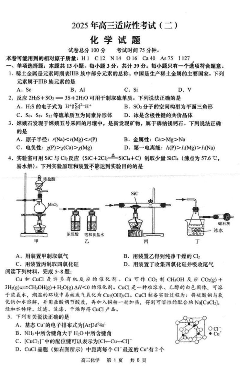 2025届江苏省南通市如皋市高三适应性考试(二)化学考试已于近日开考,为方便考生考后及时查看考试情况,查漏补缺、弥补不足,本文整理了试题答案解析相关信息!