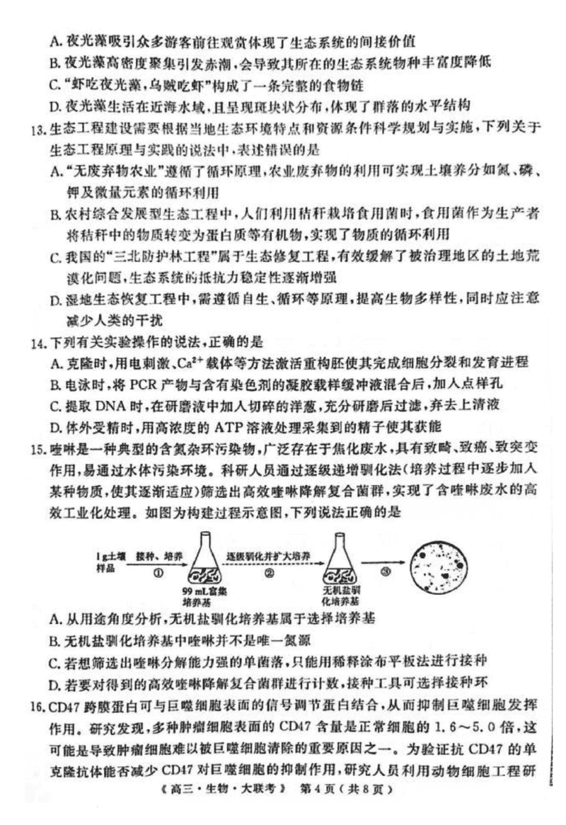 河南H20高中联盟2025届高三下学期4月联考生物试题及答案