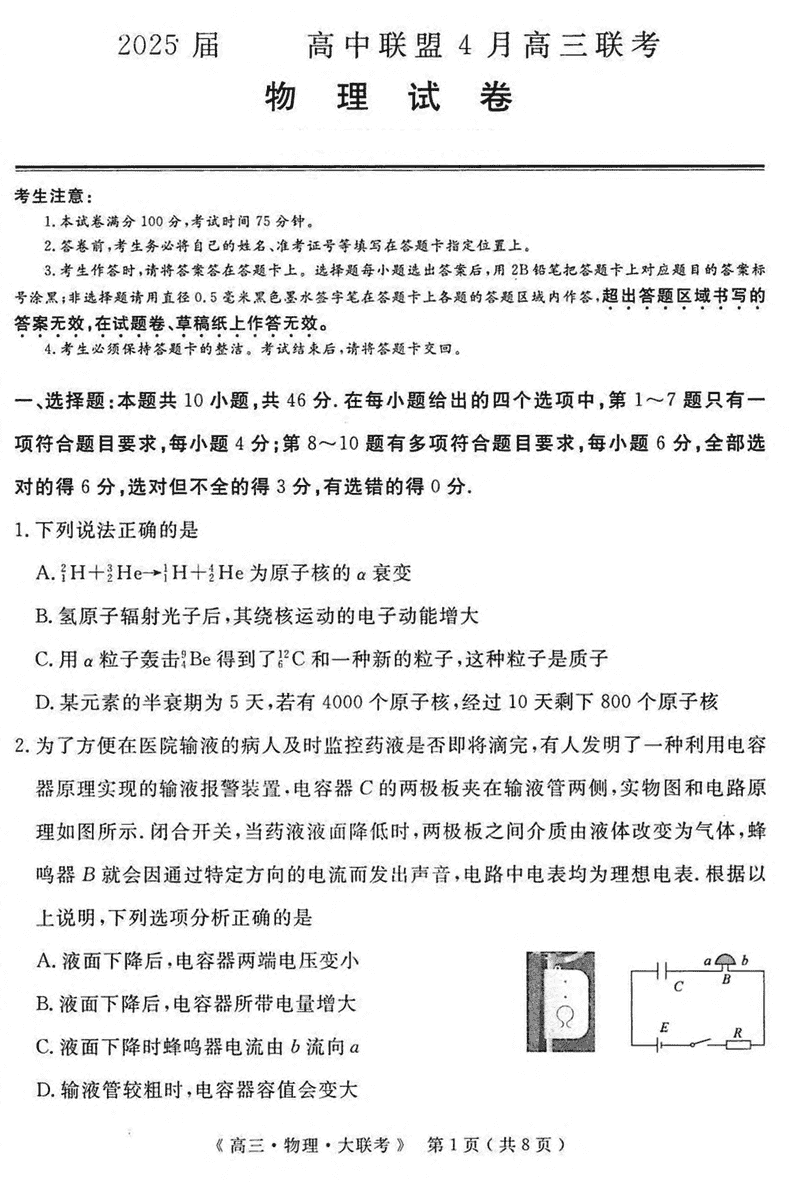 河南省H20高中联盟2025届高三下学期4月联考物理考试已于近日开考,为方便考生考后及时查看考试情况,查漏补缺、弥补不足,本文整理了试题答案解析相关信息!