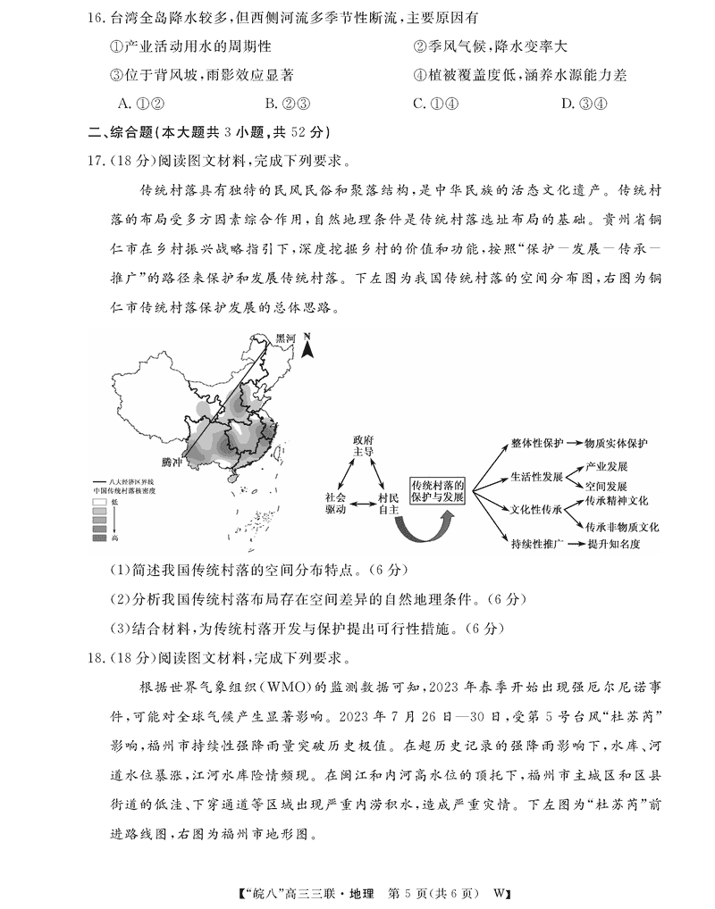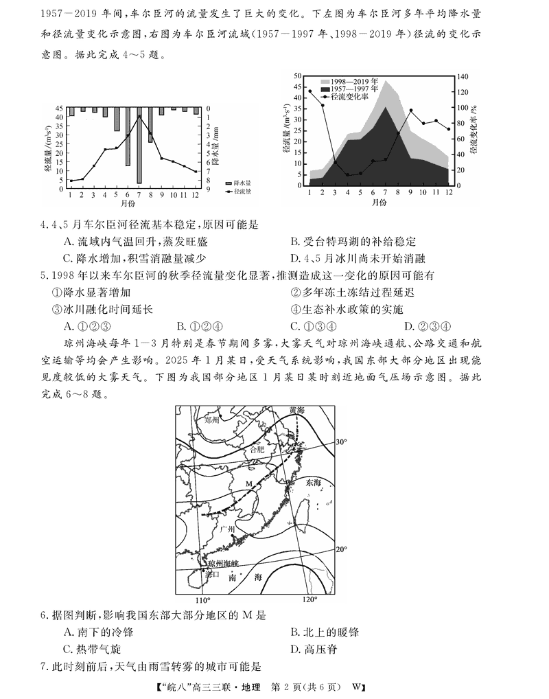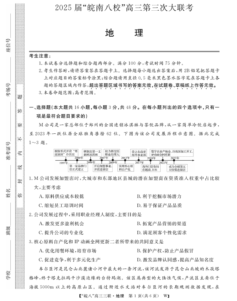 安徽皖南八校2025届高三第三次大联考地理试题及答案