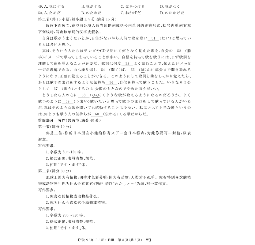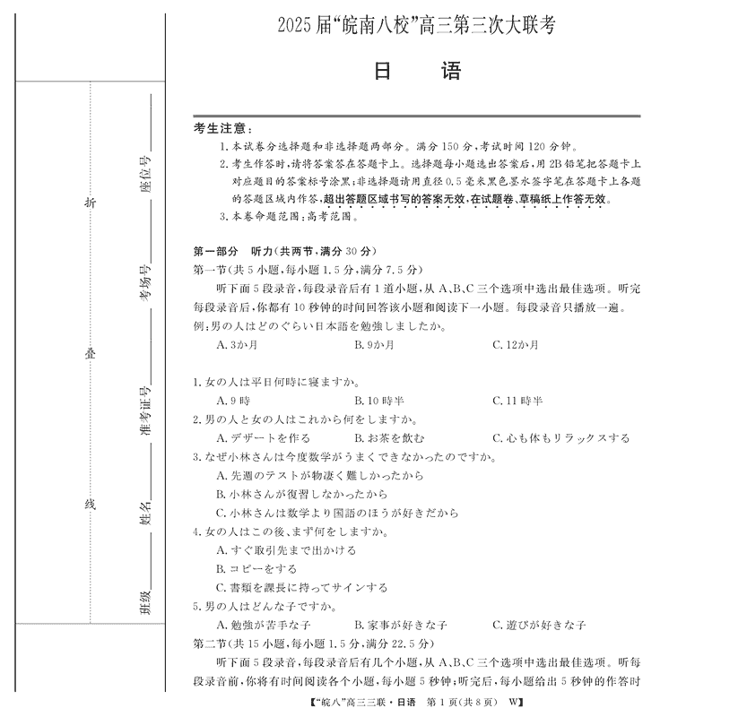 安徽皖南八校2025届高三第三次大联考日语考试已于近日开考,为方便考生考后及时查看考试情况,查漏补缺、弥补不足,本文整理了试题答案解析相关信息!