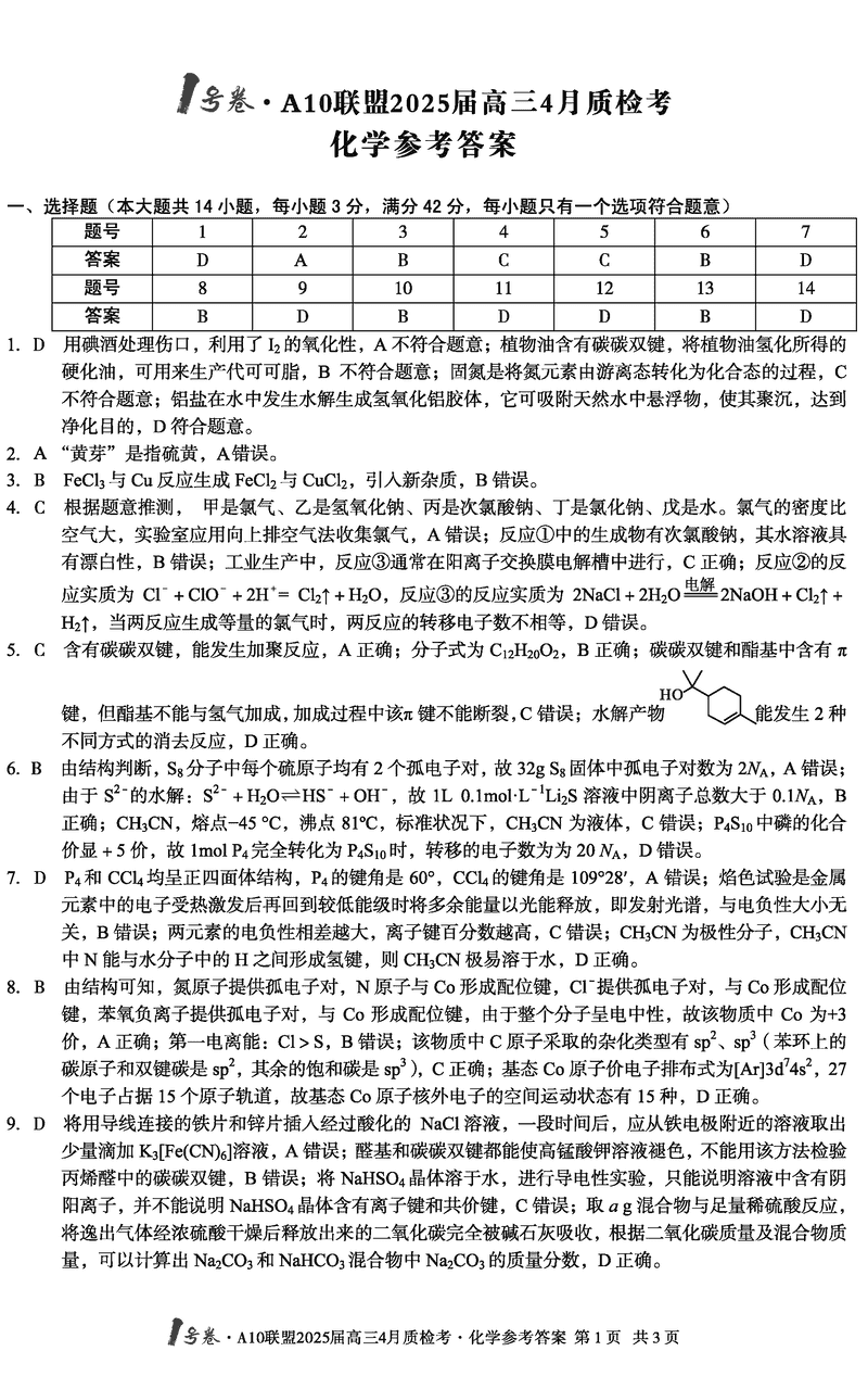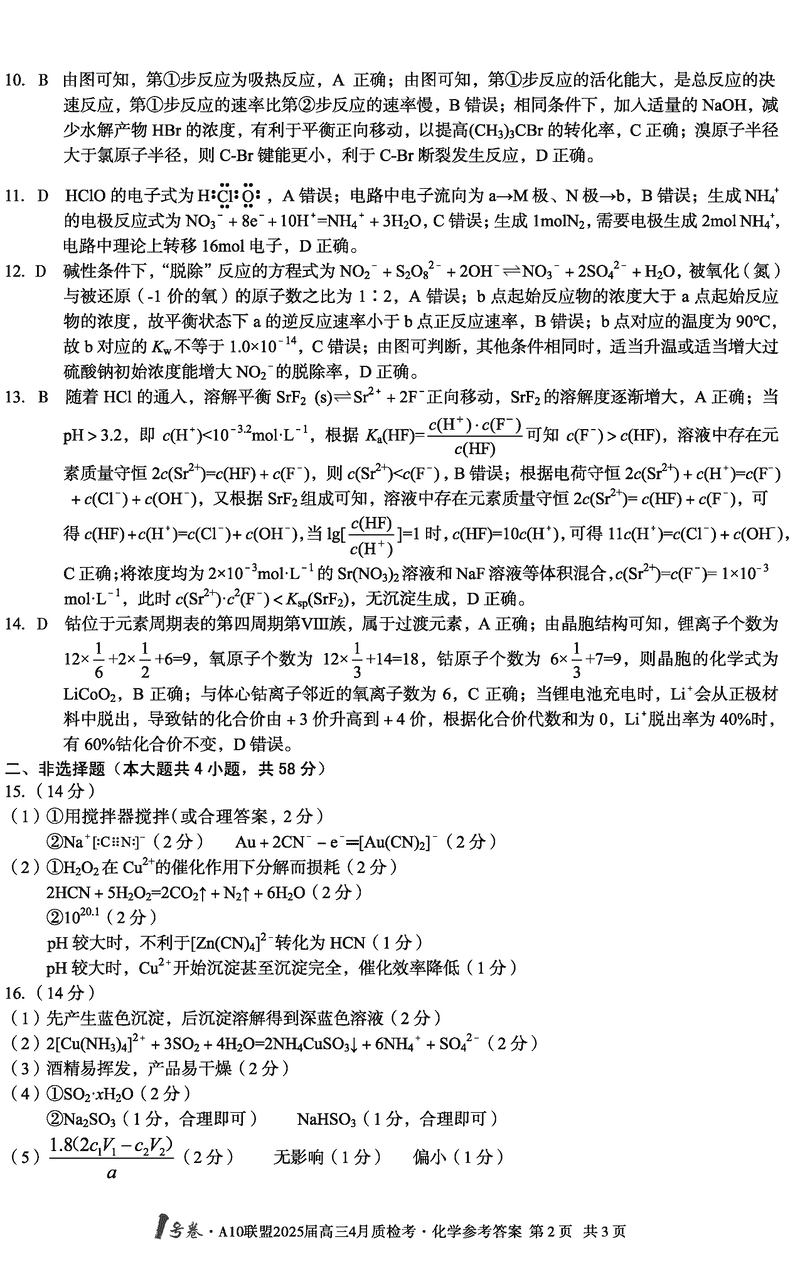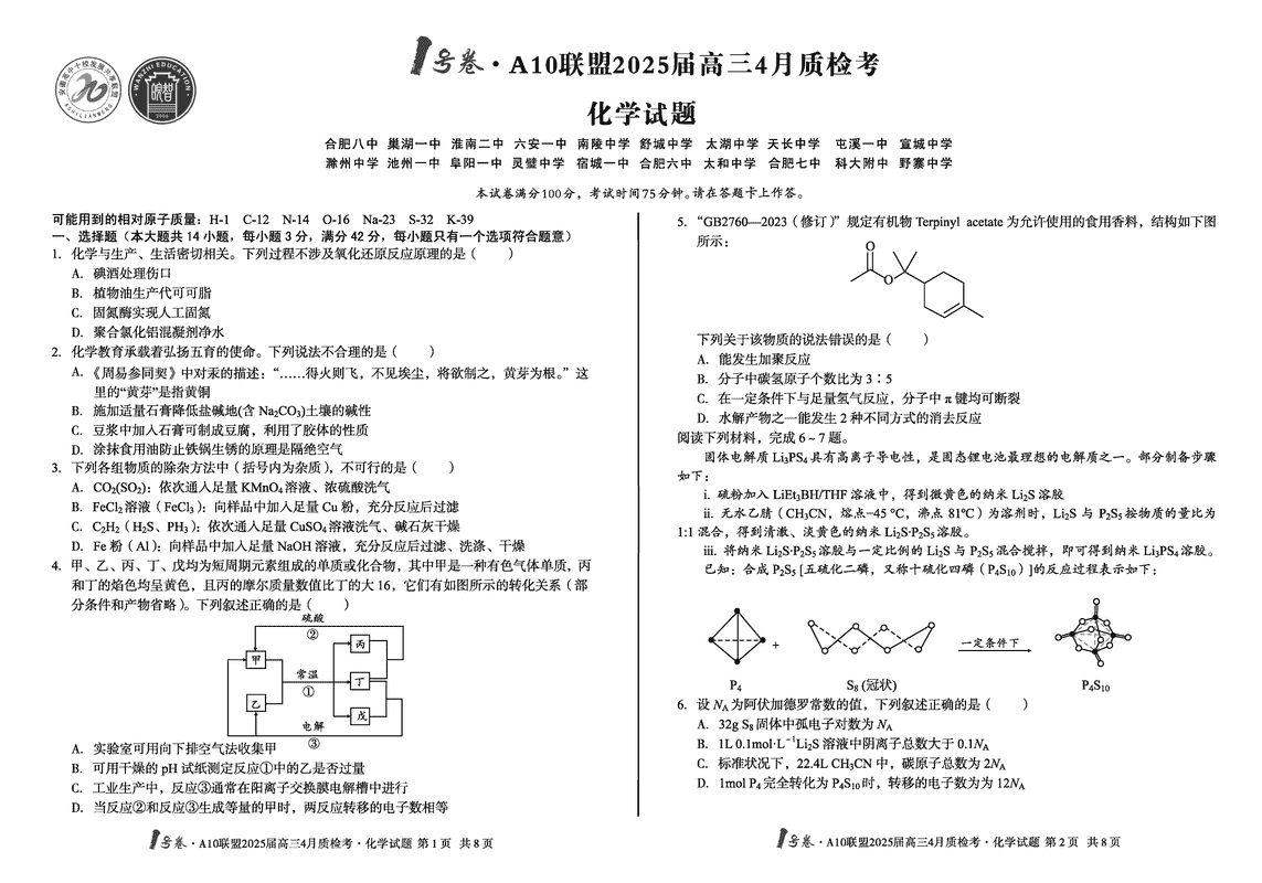 安徽省1号卷·A10联盟2025届高三4月质检化学试题及答案