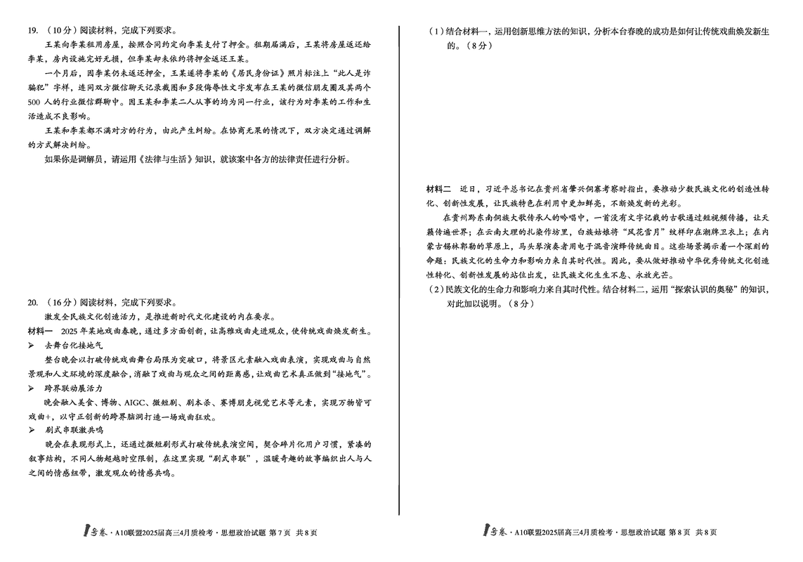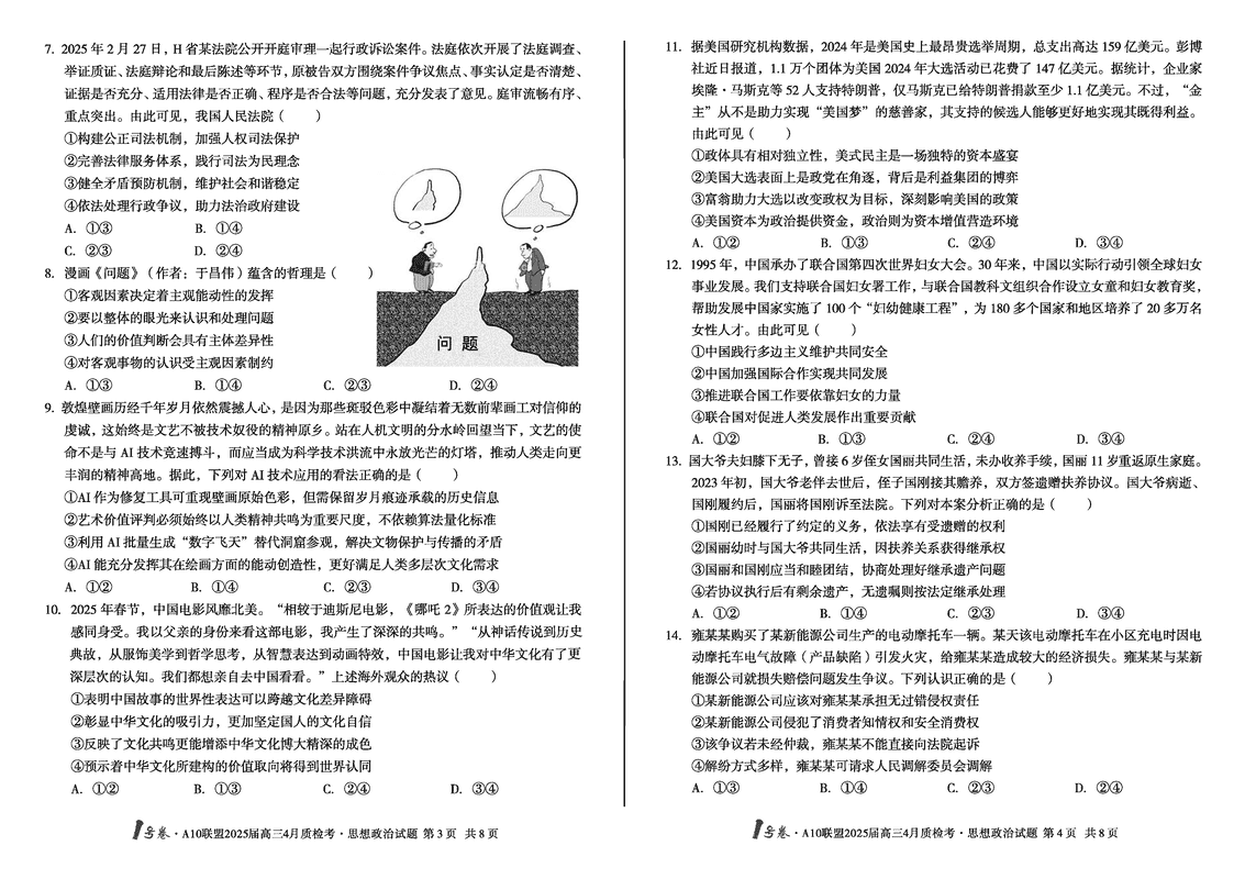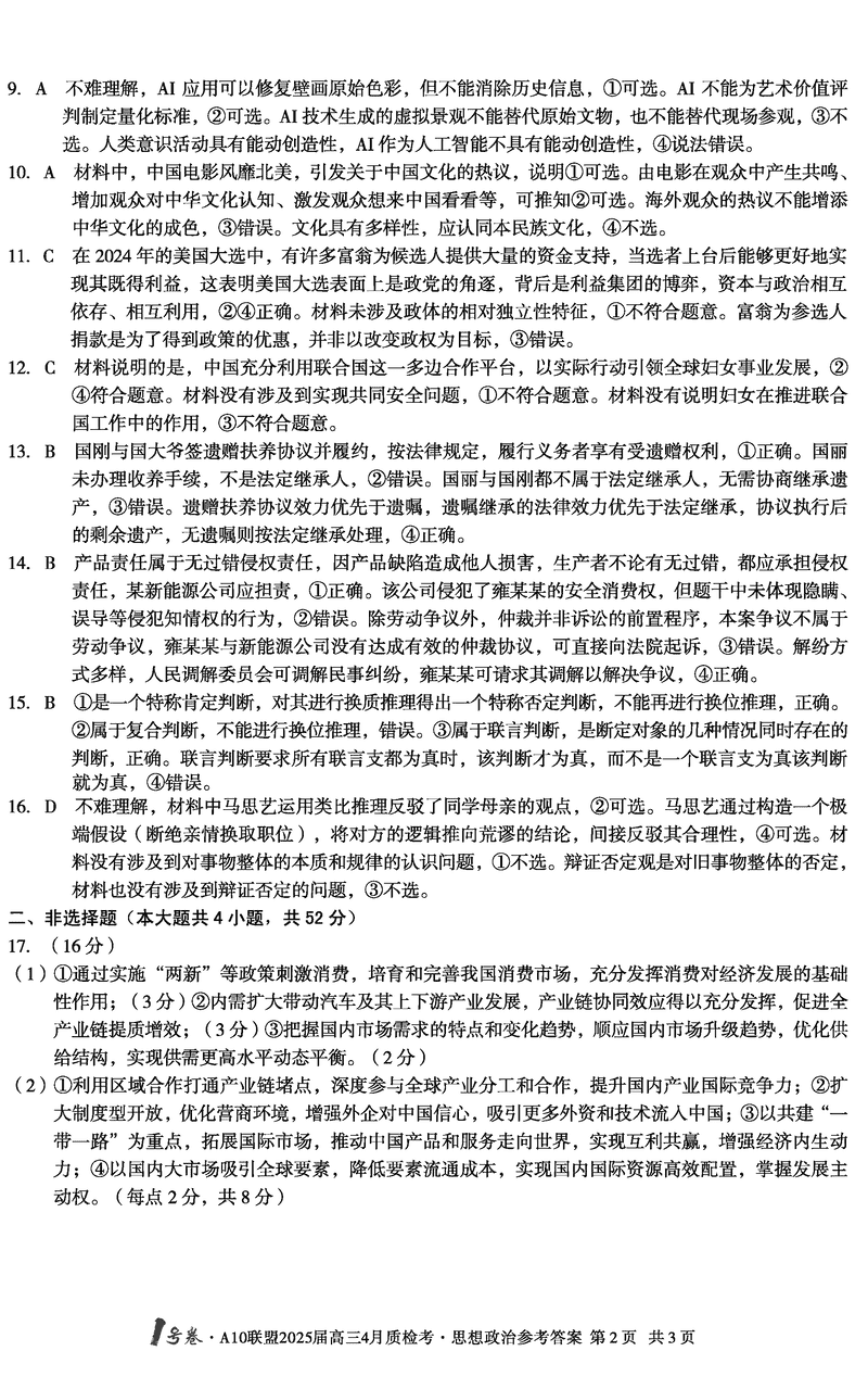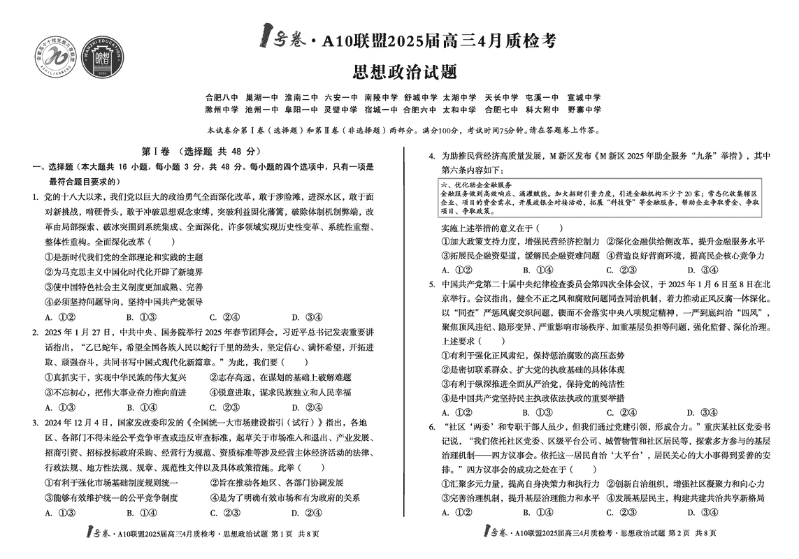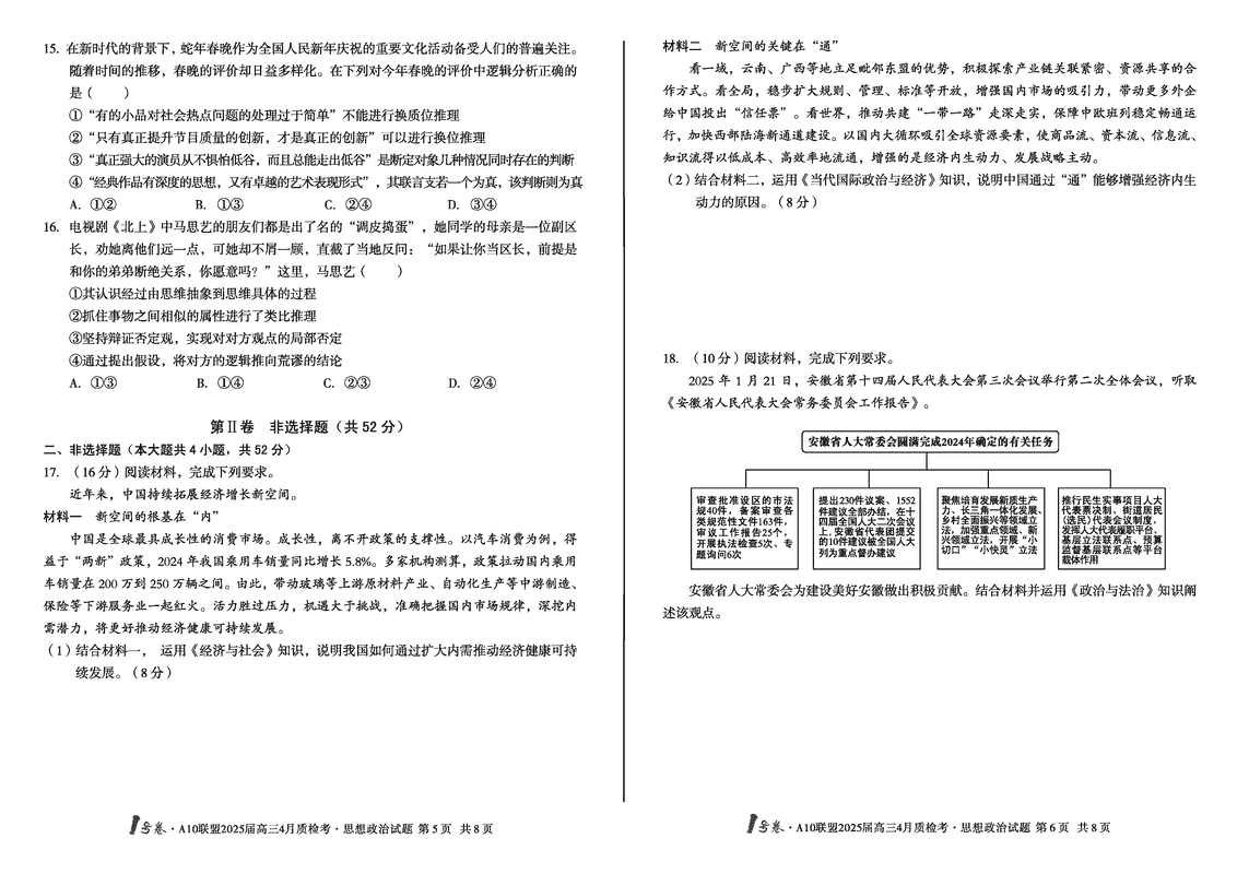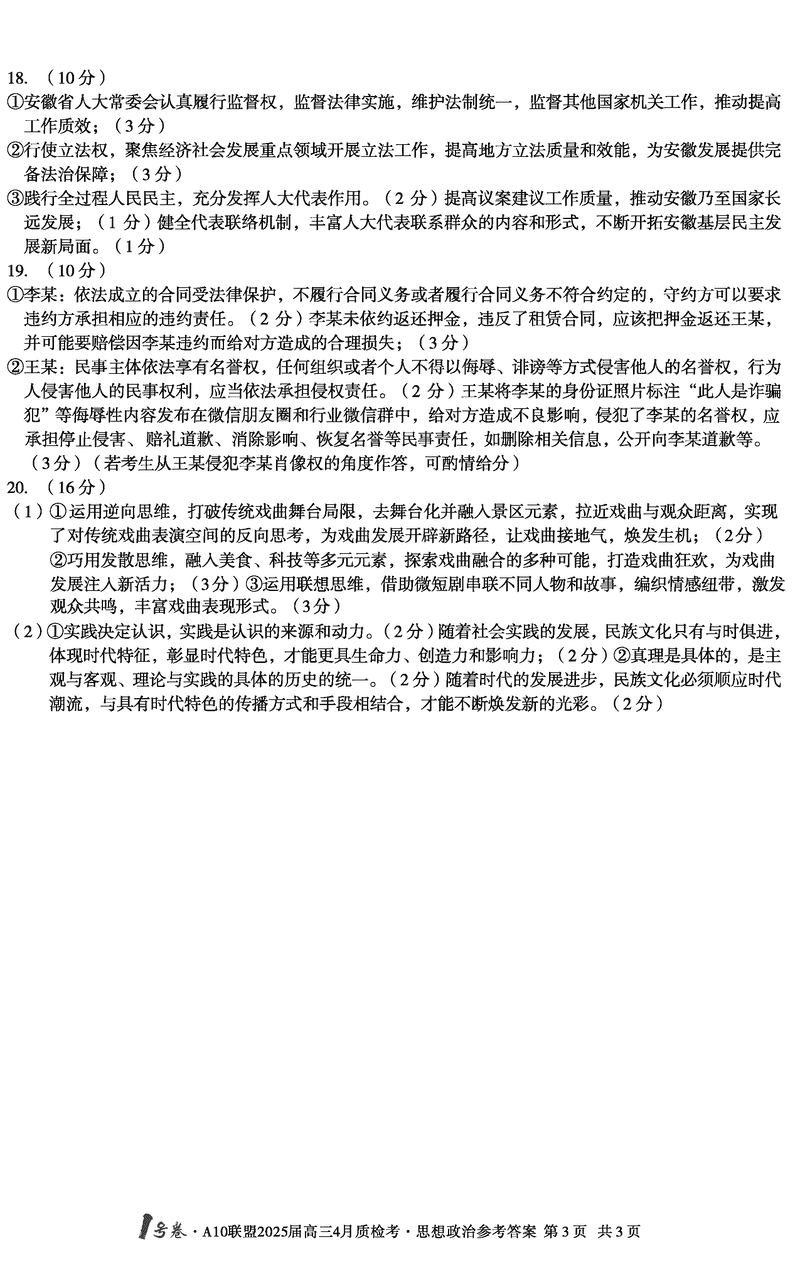 安徽省1号卷·A10联盟2025届高三4月质检政治试题及答案
