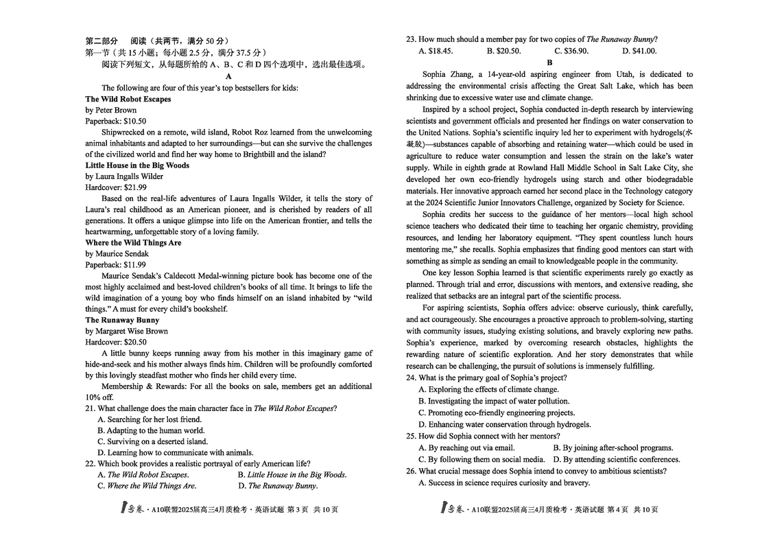安徽省1号卷·A10联盟2025届高三4月质检英语试题及答案